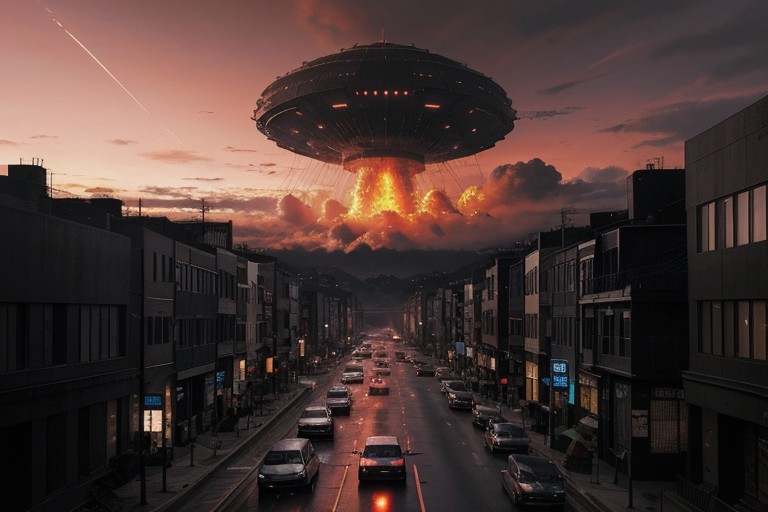 Blame! by Tsutomu Nihei like picture a black gigantic reflective cubic spaceship is flying through a burning sky, while a war is on the streets, white everywhere, cables and tubes everywhere
