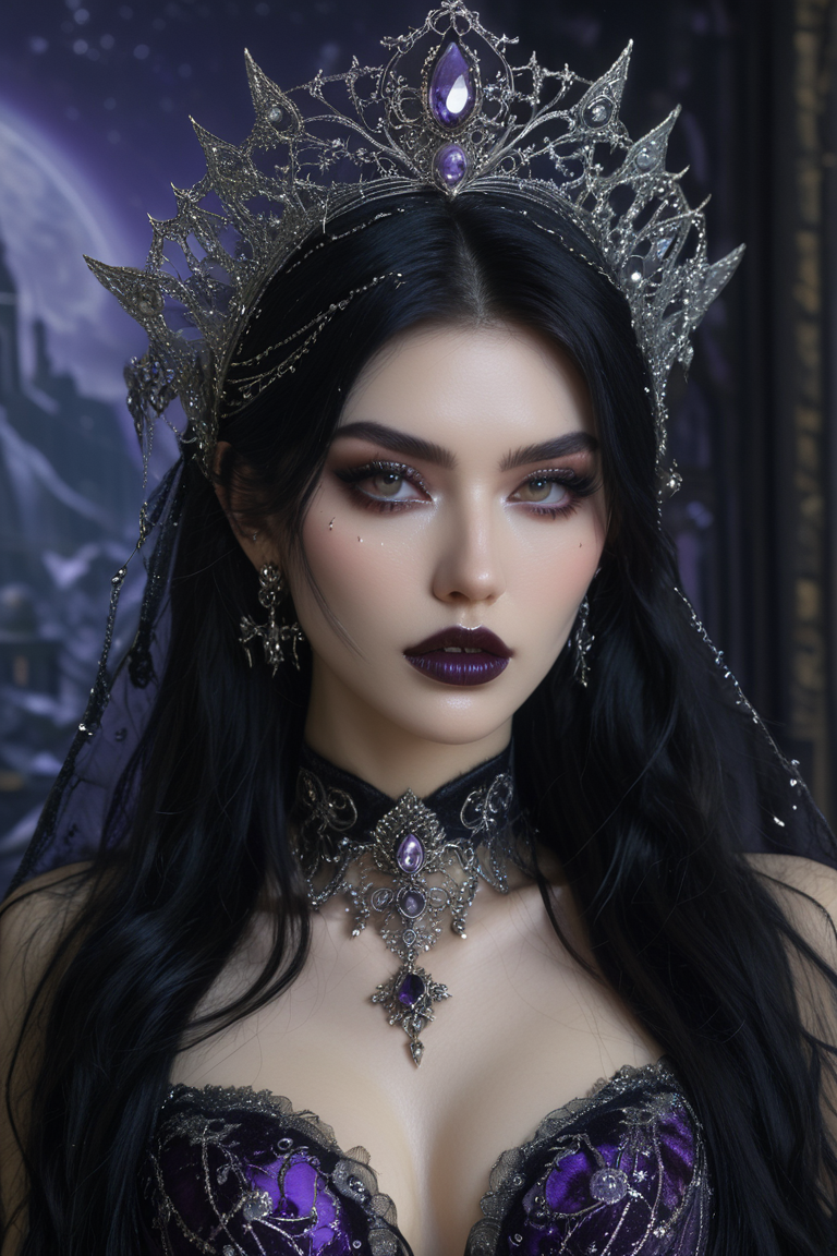 (HD, masterpiece, best quality, hyper detailed, ultra detailed, super realistic),A mesmerizing close-up portrait showcases a young woman with a distinct gothic aesthetic, captured against a richly textured backdrop. Her long, raven-black hair flows loosely, adorned with small metallic clips shaped like stars and moons. A shimmering silver headpiece rests gently on her forehead, featuring a small pentagram charm that enhances her enchanting allure. Her makeup is striking, featuring deep plum lipstick and winged eyeliner, with glitters accentuating her cheekbones and lending a magical touch. She wears an ornate velvet choker with a vintage brooch at the center, completing her alternative ensemble. The scene is bathed in soft lavender lighting, enriching the atmosphere and highlighting her ethereal beauty as she gazes into the camera with an air of mystery., SDXL Sexy clothing collection, SDXL super_beauty_face SDXL Lightning, SDXL Hands XL + SD 1.5 + FLUX.1-dev, SDXL detailed_notrigger<lora:SDXL Sexy clothing collection.safetensors:0.8:0.8> <lora:SDXL super_beauty_face SDXL Lightning.safetensors:0.8:0.8> <lora:SDXL Hands XL + SD 1.5 + FLUX.1-dev.safetensors:0.8:0.8> <lora:SDXL detailed_notrigger.safetensors:0.8:0.8>