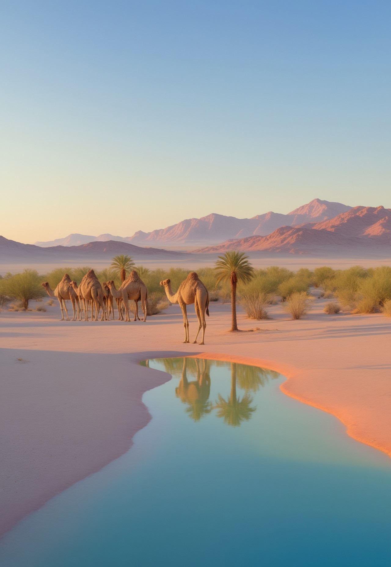 high-quality, Photorealism, masterpiece, at dawn,. Offcenter focus is on an oasis with a small palmtree forrest (small forrest of palmtrees and low bushes) around an azure blue oasis Lake with crystal clesr water. A camels drinking from the Lake. The pastell yellow / beige! / ocher of the dessert contrasts heavily to the oversaturated vivid green / azure / pink of the oasis The orange glow of the sky contrasts with the cold blue shadows of the desert, The scene is intense and otherworldly capturing a serene moment of relief (elaborate fine details:1.1), (hyperdetailed:1.1), (intricate details:1.0), (Refined details:1.1), (best quality:1.1), (high resolution:1.2)