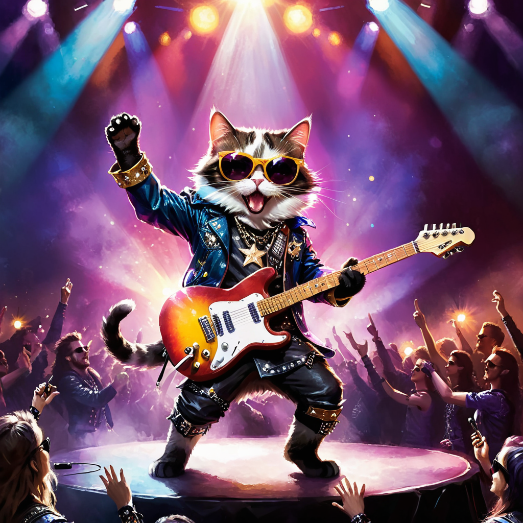 ethereal fantasy concept art of A cat dressed in rockstar attire with a guitar, performing on a stage with dramatic lighting and a cheering crowd, with sunglasses <lora:SDXL_Vanessa Stockard_Sa_May:0.5> . magnificent, celestial, ethereal, painterly, epic, majestic, magical, fantasy art, cover art, dreamy