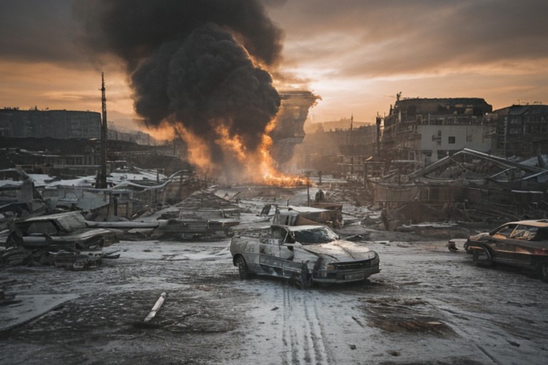 cityscape, post-apocalyptic Magadan, sunset, destroyed buildings, ruined cars, smoke trails from fires