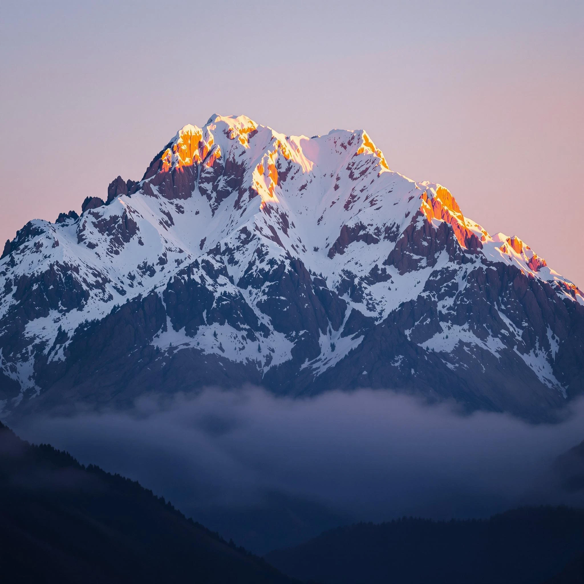 a majestic snow-capped mountain peak bathed in a warm glow of the setting sun