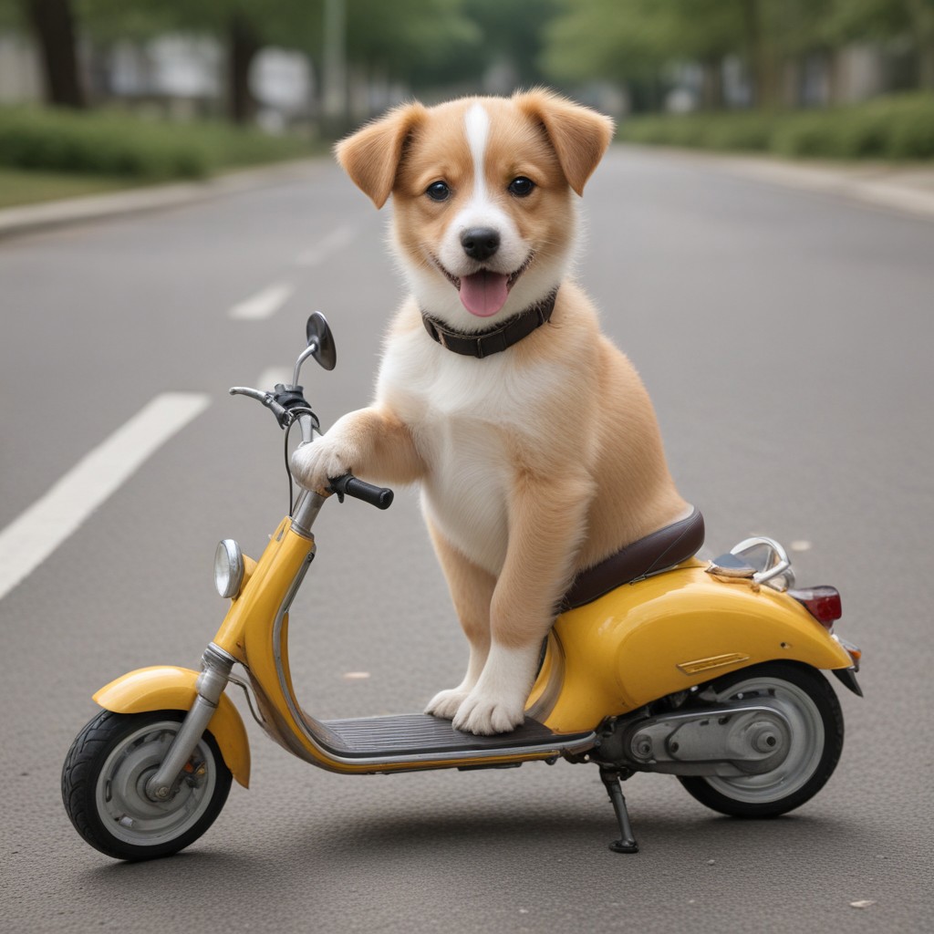 Photo-realistic report photograph of a cheerful puppy on a scooter
