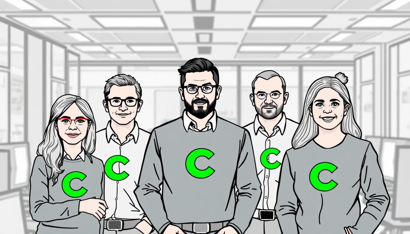 Draw an implementation department where three dozen people work, there are analysts, developers, there are two project managers and there are consultants, draw them in branded clothes with the logo of the green letter C depict all Caucasians and so that all people enter the frame