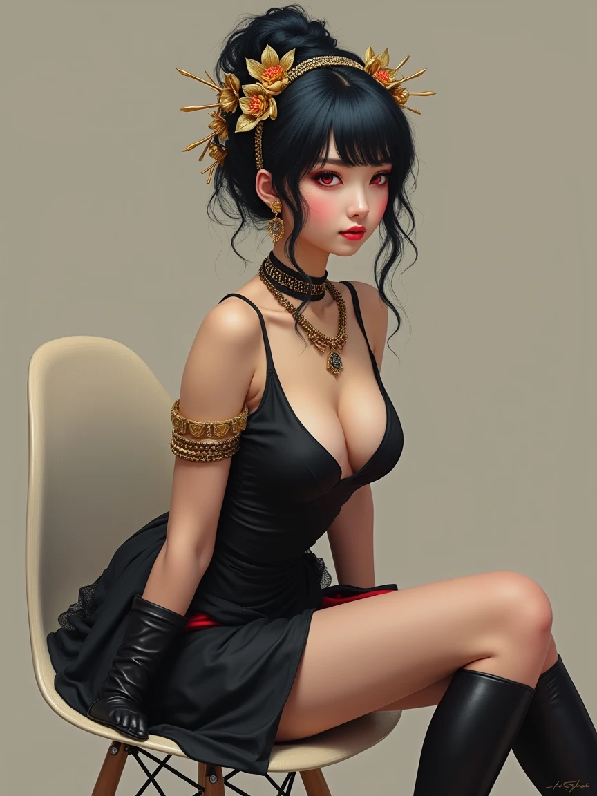 oil painting, Monat style, a beautiful woman with a pale skin tone, she has an innocent smile on her face, her eyes are red, svelte, she has black hair with a dark blue undertone, her black hair is in a fancy bun except for some loose hair on either side of her head, she has bangs, she wears a golden headband with beautiful gold flowers on either side of her head, there are long gold spikes coming out of the bottom of the golden flowers on either side of her head, she wears geometric gold earrings, she is sitting on a smooth hard plastic chair that is white and curved like the shell of an egg, the chair is on a metal frame with an X- shape at the bottom, she wears a sleeveless black mini dress with a longer skirt in the back, she wears a black necklace made of three layers of black plastic arranged in a cage pattern, there is a gold rose charm hanging from her necklace, her skirt is long in the back but stops above her knees in the front, the red lining of her skirt is visible, she wears knee high tall leather boots with heels, the soles of her heeled boots are the same red as the inner lining of her skirt, she holds a large long golden needle loosely in one hand, the needle drips red liquid into a puddle on the ground, the background is teal,