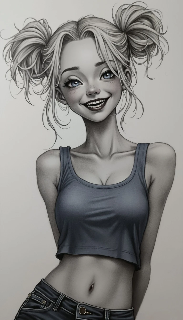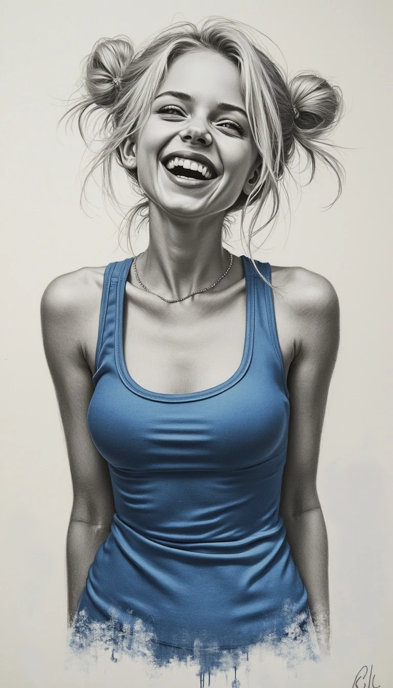 Hyper Detailed Charcoal Sketch, beautiful, charming, svelte, thin, fair, pale, youthful, jovial, platinum blonde hair, space buns, dark blue eyes, giggling, happy, cheerful, joy, 18 years old, wearing fitted blue tank top,