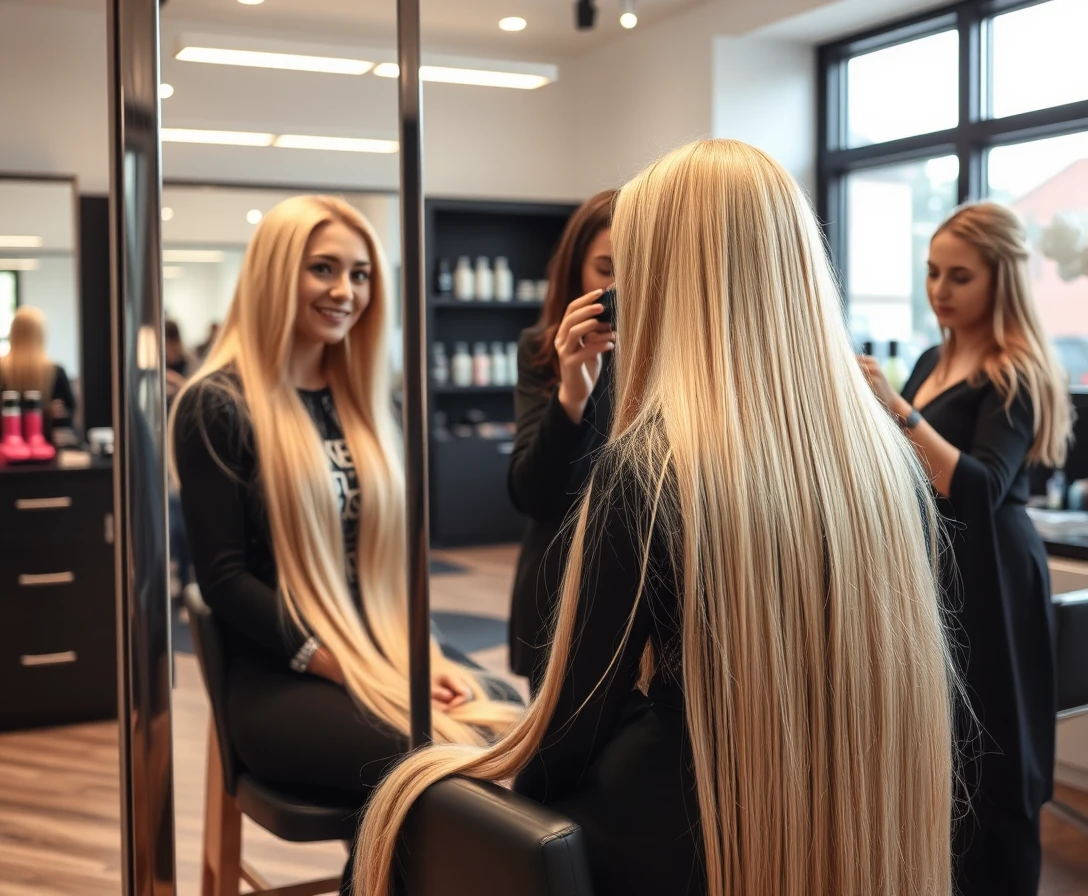 a beautiful slim woman with extremly long blond hair like a reallife rapunzel sits in a hairdressing salon and looks at herself smiling contentedly in the mirror, two beautiful styled woman who work in the salon are caring the straight rapunzel hair brushing out and detangle it carefully, some customers admires faszinated the beaitiful rapunzel hair