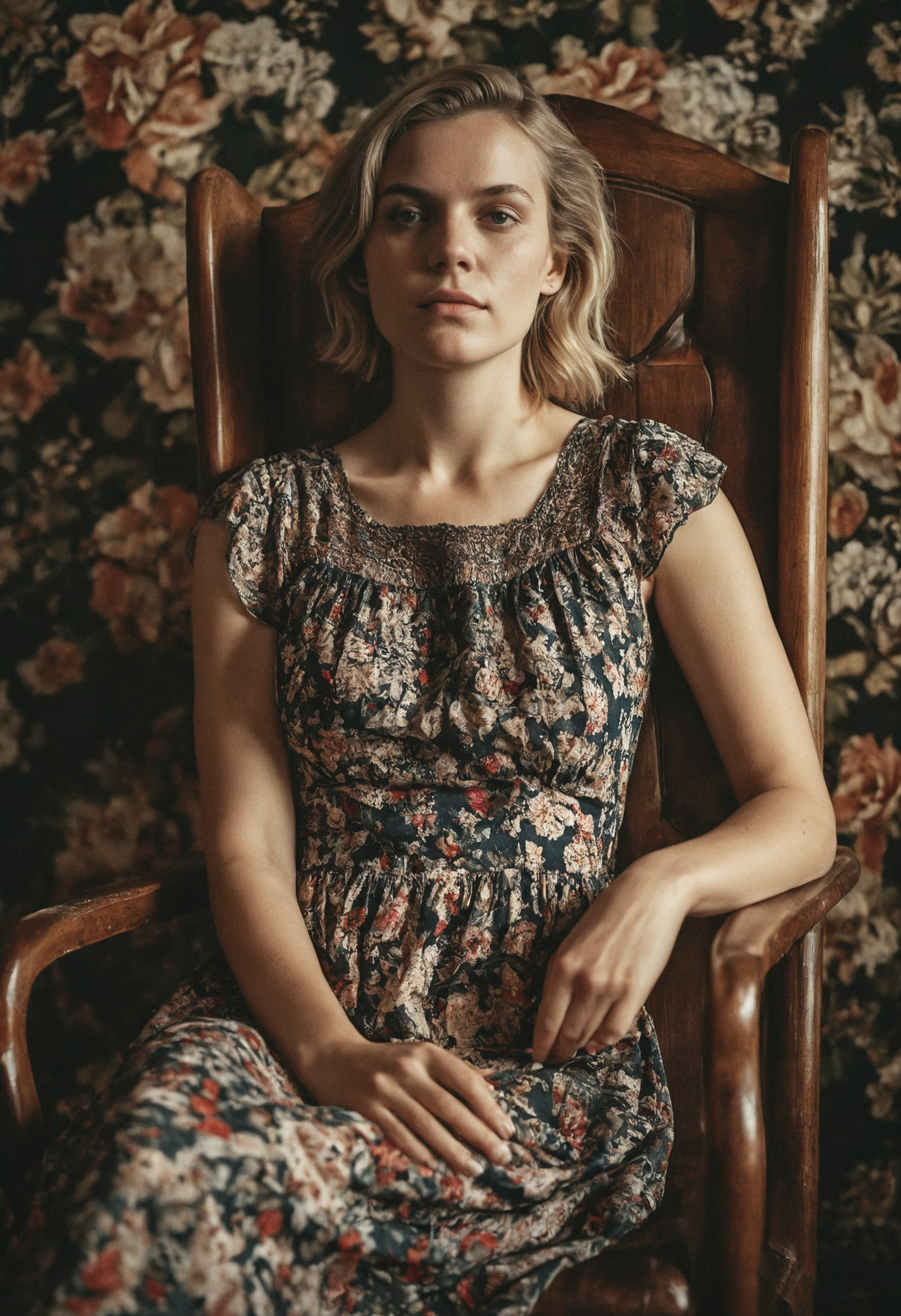 Engulfed By colour, a portrait of a German woman sitting on a wooden chair in a floral dress, intricate detail, modern, 16k, digital art, artstation, cinematic lighting, vivid, professional 3d model analog film photo, a portrait of a beautiful German 18yo woman, faded film, desaturated, 35mm photo, grainy, vignette, vintage, Kodachrome, Lomography, stained, highly detailed, found footage . octane render, highly detailed, volumetric, dramatic lighting