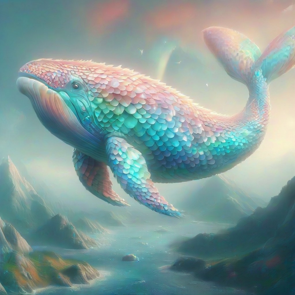 breathtaking digital illustration, surreal painterly style, "Iridescent Adventures", majestic intimidating flying sky titan (a giant and enormous whale-dinosaur-turtle hybrid)soaring through a fantasy world, metallic shifting color with changing light, covered with iridescent scales, p1nk1r1sc4l3s, easynegative expansive fantasy landscape, floating islands adorned with crystal forests, cascading waterfalls flowing upward, ancient temples perched atop towering cliffs, glowing flora, mystical creatures roaming terrain immense size of sky titan illustrated by tiny airships and floating cities appearing minuscule near its wings, vast mountain ranges and oceans tiny beneath its shadow, adventurous humans with grappling hooks and jetpacks approaching titan, highlighting colossal scale, daring exploration mischievous robotic raven perched on titan's massive beak, observing scene with gleaming eyes sky adorned with swirling auroras resembling Aurora Borealis, ethereal light cascading around titan, emphasizing otherworldly presence dynamic lighting, shimmering iridescent scales, dramatic low-angle perspective enhancing grandeur and intimidating aura epic, awe-inspiring atmosphere, combining fantasy and science fiction, embodying essence of "Iridescent Adventures"