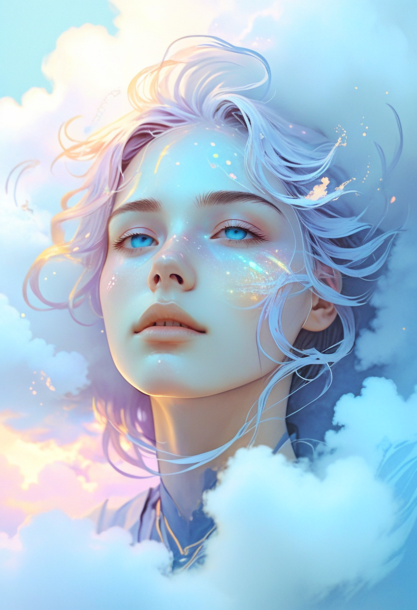 Ink illustration, (anime:0.1), aged blue paper, inkpunk, portrait, face, front view, warm tones by Pablo lobato Surreal Glow, Dreamlike Tranquility, Luminous Contrast, Stylized image with sharp lines and flat colors. Her figure is fluid, with cloud-like hair that extends outward, forming soft, drifting shapes, her skin is almost transparent, with a faint shimmer as if reflecting light from within, her face has minimal features, her eyes appearing as glowing orbs in a soft haze, outfit woven from mist, clinging to her and then disappearing, her hands fade into translucent vapor at the fingertips, she floats within a realm of shifting clouds, surrounded by faint glows of pastel colors, and the environment around her seems to dissolve into endless, dreamy mist.