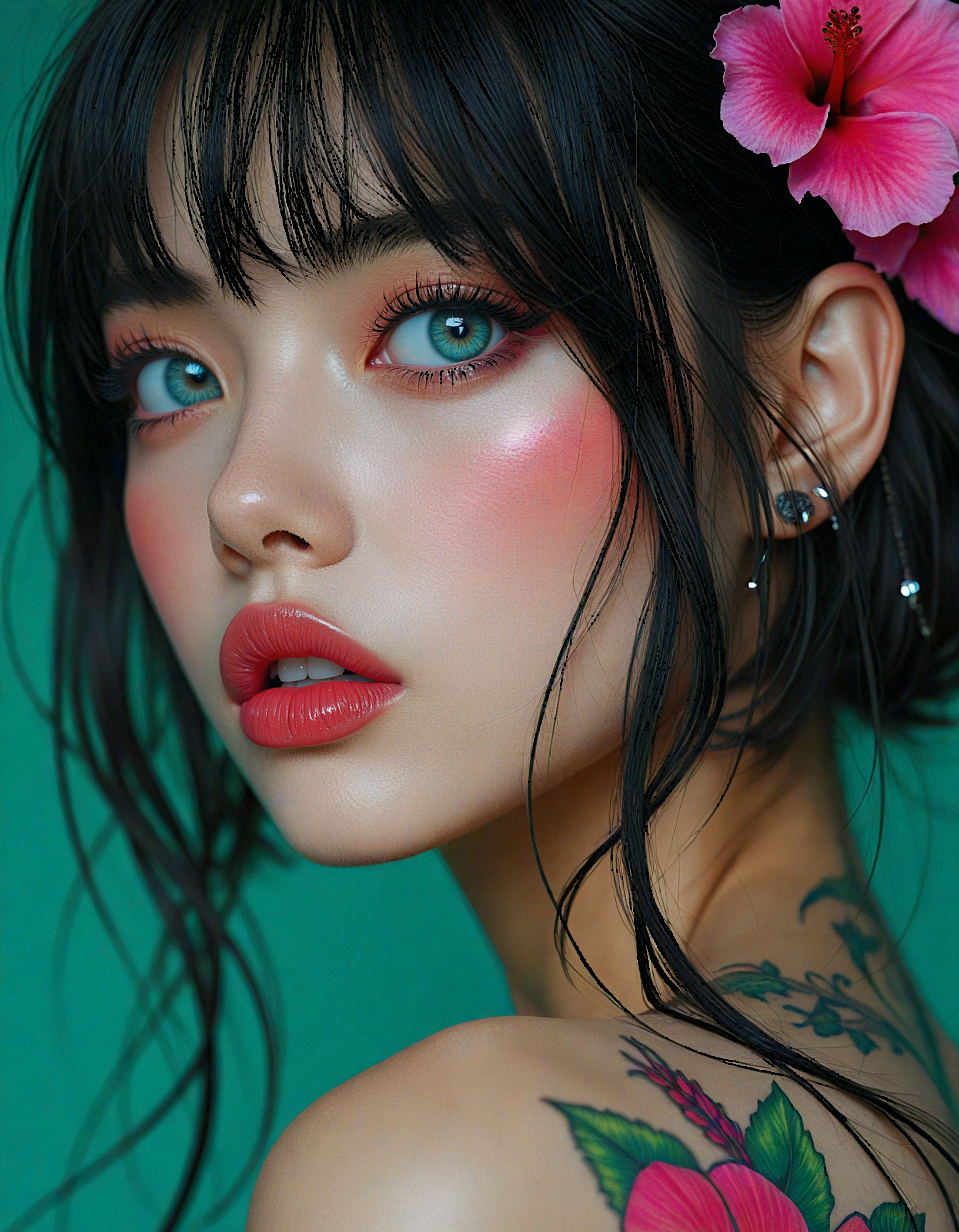 macabre style semi-realistic, Hyperrealism, extreme close-up Portrait of a beautiful, stunning unique female character. She has large turquoise eyes filled with joy and excitement, extravagant eyelashes, making this image a masterpiece of photography and digital art. Style: realistic hyper-detailed rendering, 32k UHD, expressive eyes, punk, graphic design, pink hibiscus tattoo on her shoulder, girl's face, side view, pretty and cute, gleaming lips, white skin, telling a tale of adventure. Exuding confidence and serenity. Vibrant tattoos adorn her sun-kissed skin, side-profile,within the eternal forest of whispers,style by Luis Royo,bloom light . dark, gothic, grim, haunting, highly detailed