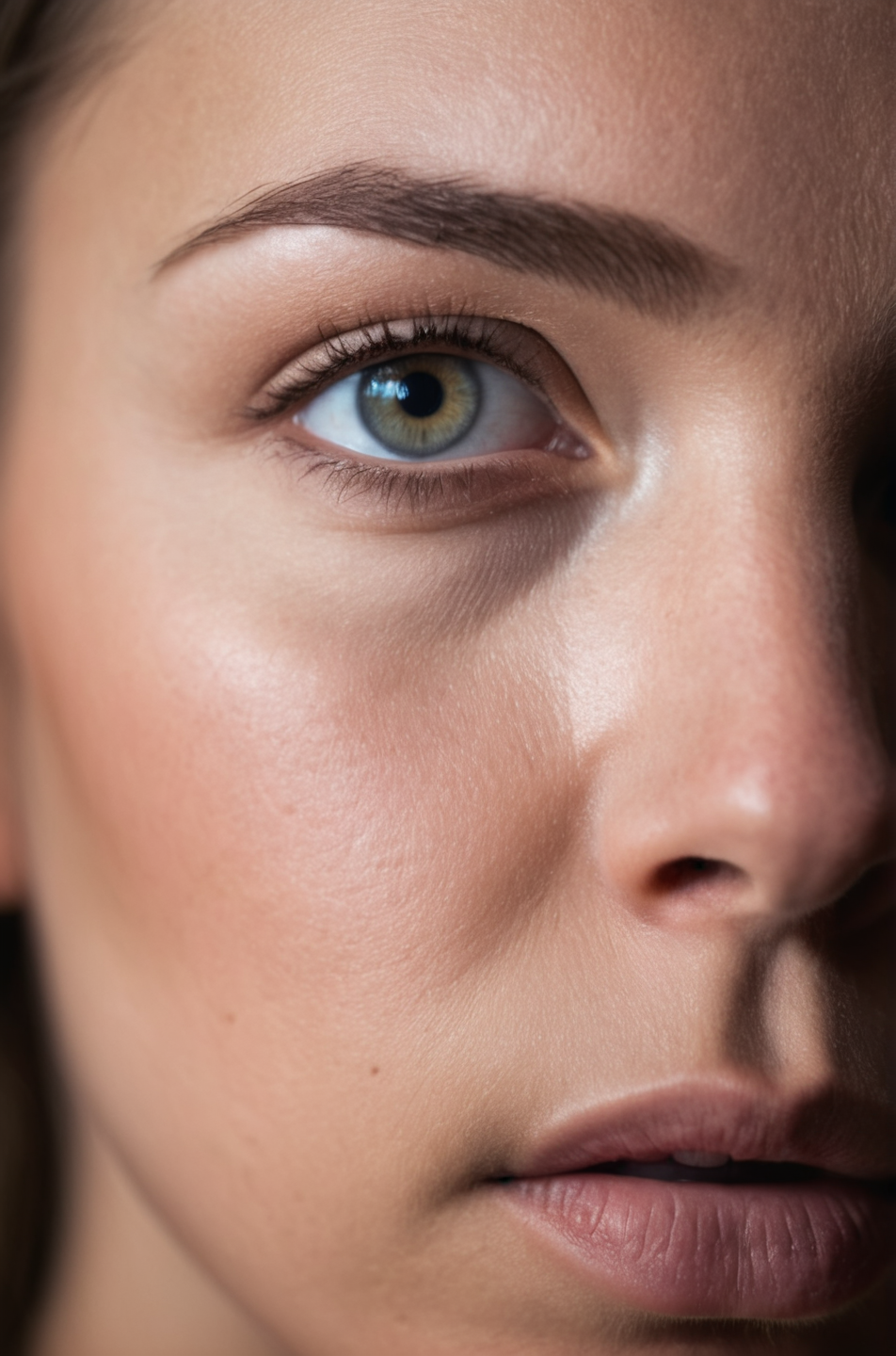RAW photo, extremely close-up of attractive female face, only one side is visible, eye in focus, delicate nude make-up, award winning, high detailed, 8k, natural lighting, analog film, detailed skin, amazing composition, intricate details, subsurface scattering, velus hairs, amazing textures, filmic, chiaroscuro, classic lighting, perfect face,