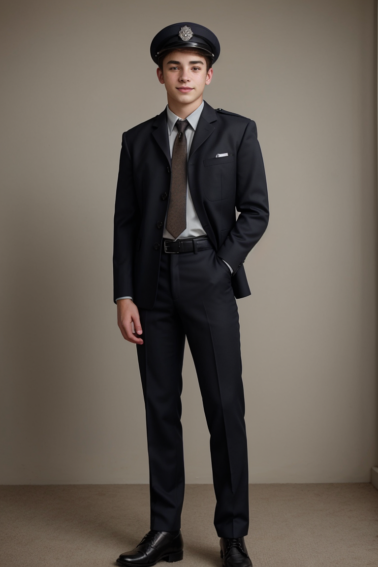 realistic, sfw, an attractive 18 years old fit caucasian boy standing, smug, full body shot, police uniform, <lora:Aaron_Cohen_v1_GV:0.7>