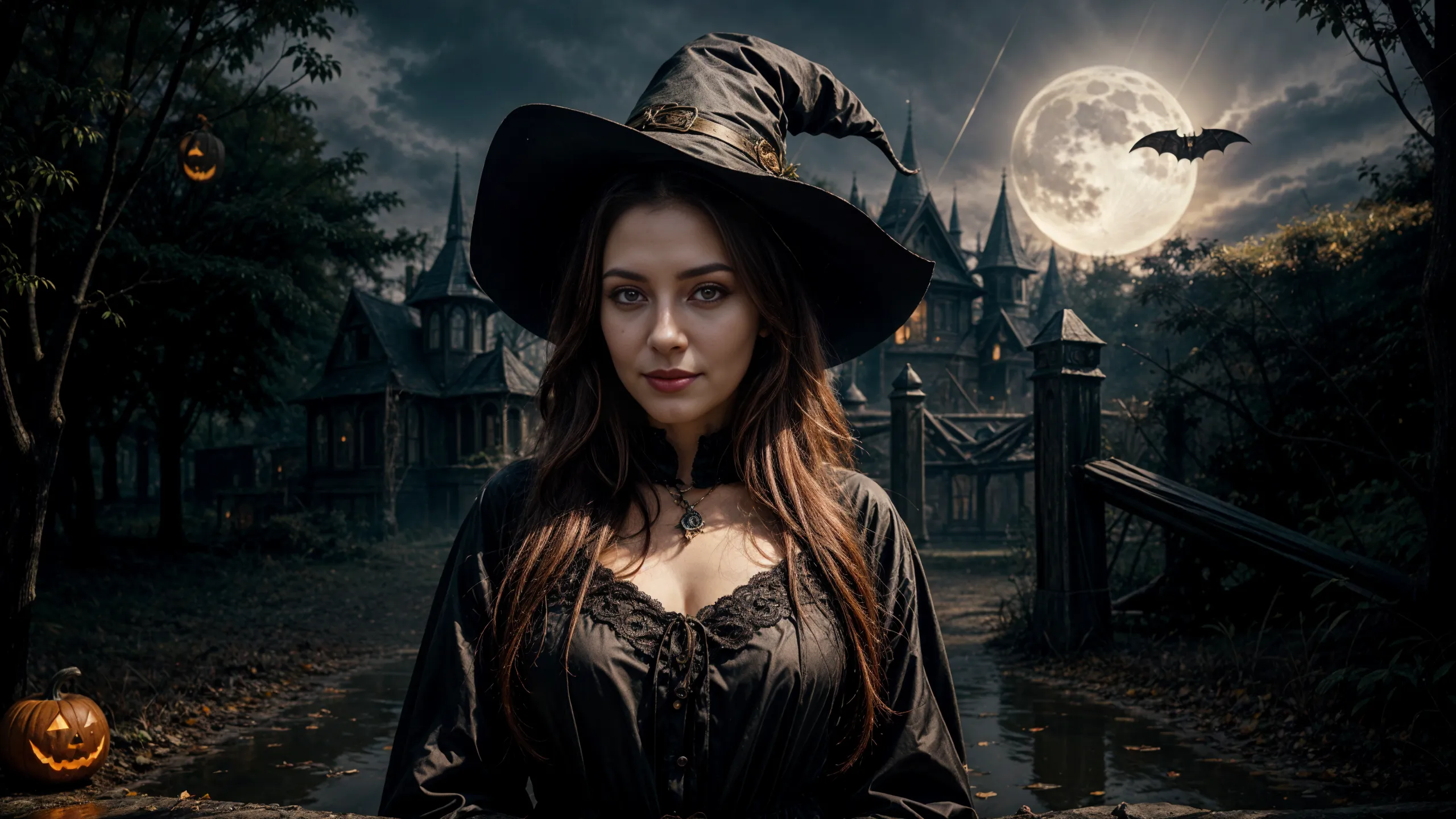 (pretty beautiful witch magician woman), (young), (Halloween pumpkins, jack-o-lantern), gloves, halloween decorations, (old magic books), (bats), moon in the sky, close-up portrait, (standing), blood-red sunset, spooky Victorian house, headless horseman, haunted mansion windows lit up, haunted fairytale, haunted rainstorm, happy smiling, flames, bright fire, red eyes, red lips, Dark Chocolate Brown magician clothes, ruins, (very detailed), best quality, smoke, mist, leafy creepy swamp, fire explosion, sharp focus, natural light, backlight, shadows, high contrast, hdr, reflections, <lora:Detail Tweaker LoRA add_detail:0.7> <lora:depth_of_field_slider_v1:5> <lora:SDXLrender_v2.0:0.9> <lora:RPGWitch:0.2> <lora:magician_beta_1:0.4>