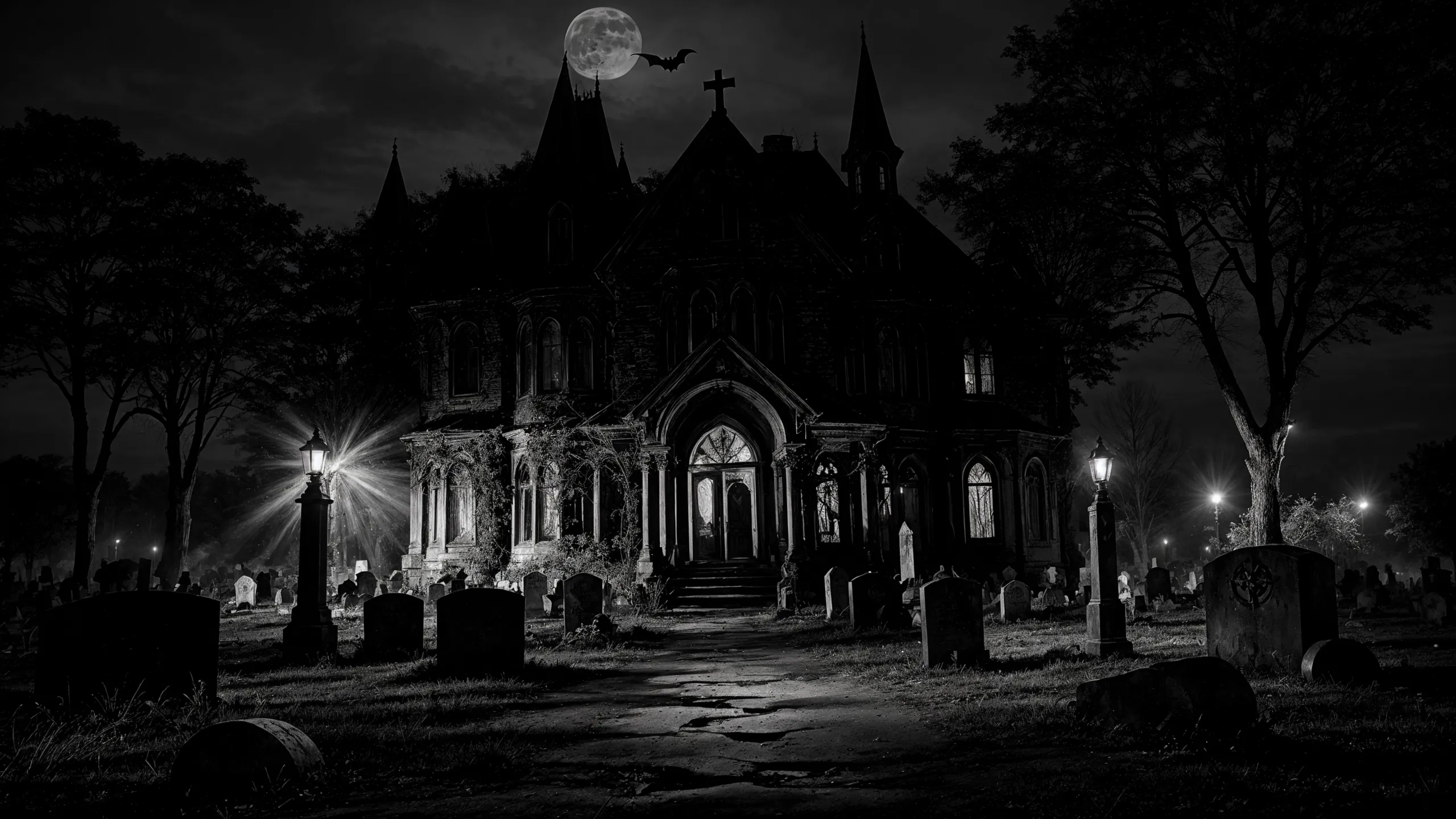 halloween night, (horror terror landscape), sharp focus, moonligh, full moon, glowing lights, burning torches, jack-o-lantern, (bats) in the sky, (vampire gothic theme atmosphere), (old creepy mansion), interior, skull, skeleton, zombie, vampire coffin, red glowing flowers, skulls,fog, fire,many crosses, far vampires, tombs, crosses, graveyard, iridiscent lights, (very detailed), (medium shot), zombies, dirty floor, trash, best quality, realistic, grey sky, dark tones, monochrome, natural light, backlight, shadows, high contrast, hdr, reflections, <lora:Detail Tweaker LoRA add_detail:0.7> <lora:depth_of_field_slider_v1:5> <lora:SDXLrender_v2.0:0.8> <lora:Vampirella SD1.5:0.5> <lora:blackandwhite:0.2>
