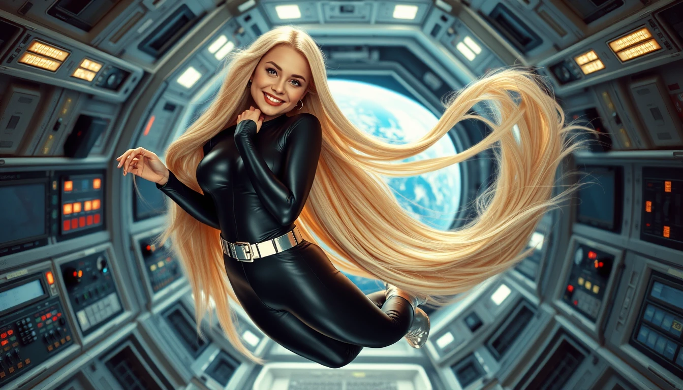 Rachel, age 25, amazing beautiful slim blonde womane floats weightless in a futuristic spaceship, she is wraped in her long blonde mane, her smooth, fine Rapunzel hair floats arround her cause there is no gravity, she wear an skintight full-lenght black shiny lycra-jumpsuits, a wide metalic silver belt and silver ankleboots, she smiles, looking dreamly in the camera, in the background many controlllights, throught the hatch of the ship the earth is visible, a ultra realistic scene in the style of an vibrant 80s sci-fi movie, full body visible
