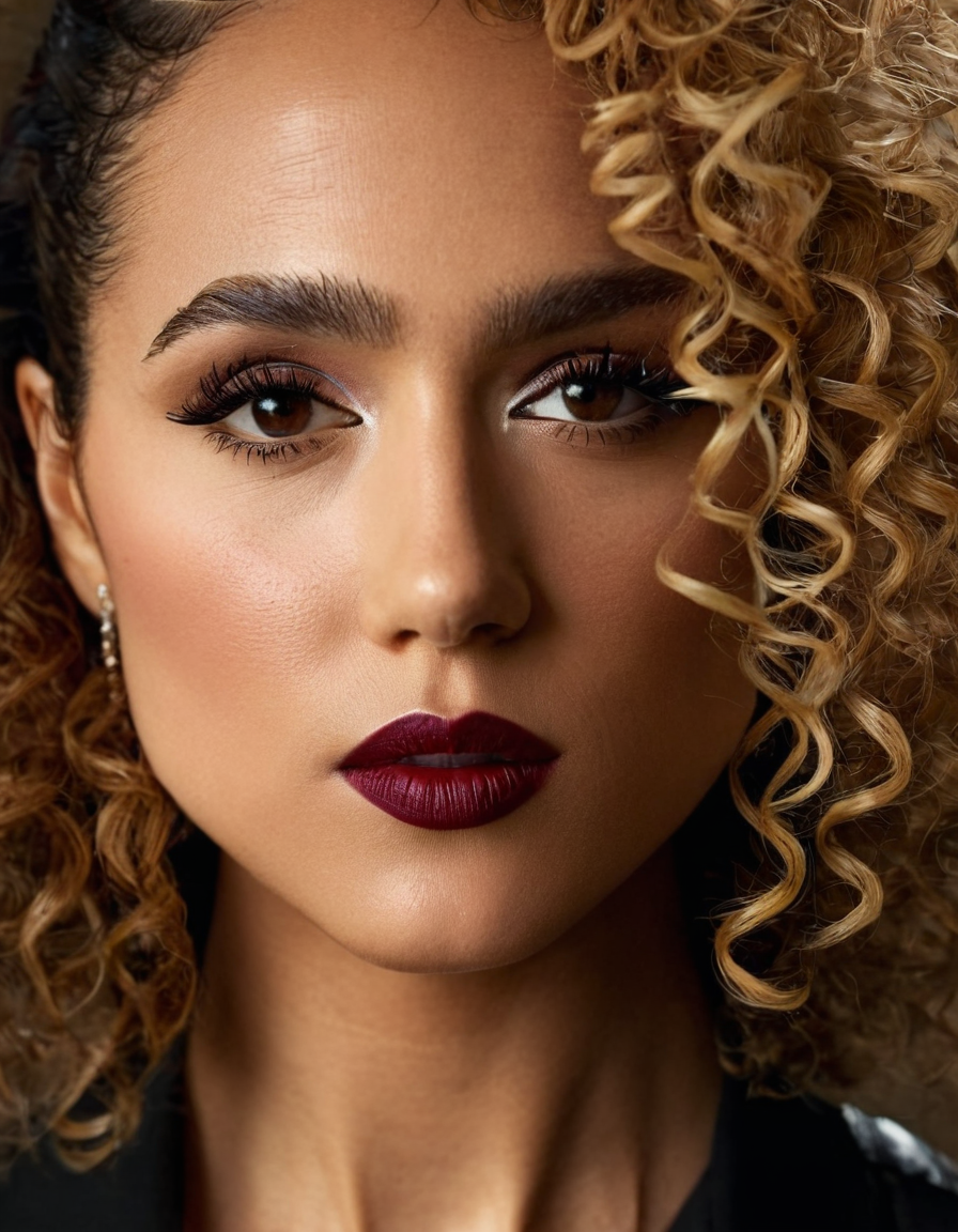 cinematic still Create a high-resolution, hyper-realistic close-up portrait of a woman with an artistic, bold expression that exudes confidence and depth. She has a fierce, intense gaze with a slight smirk or a strong, piercing look that conveys strength and allure. Her makeup is glamorous yet refined, with dramatic, smoky eyes, bold lashes, and a dark lip color that adds to the intensity. Her curly hair is styled with an artistic flair adding a sense of drama. The background is rich and textured or with a subtle abstract design, to amplify the boldness of the image. The lighting is dramatic, with high contrast to sculpt her features and enhance the intensity of her expression, giving an overall artistic and editorial feel . emotional, harmonious, vignette, 4k epic detailed, shot on kodak, 35mm photo, sharp focus, high budget, cinemascope, moody, epic, gorgeous, film grain, grainy