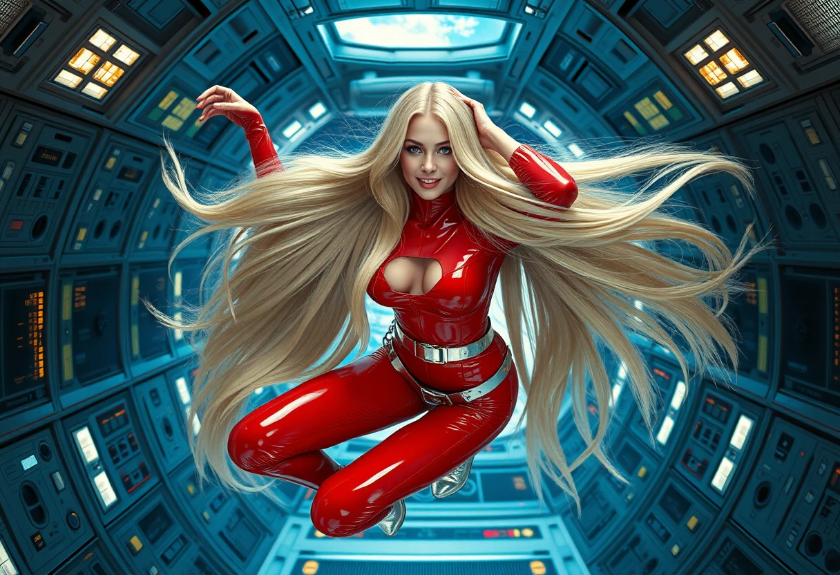 Cindy, age 25, amazing beautiful slim blonde woman floats weightless in a futuristic spaceship, she is completely wraped in her long blonde mane, her smooth, fine Rapunzel hair floats wide feathering around her without gravity, she wear a skintight full-lenght red shiny pvc-jumpsuits, a wide metallic belt and silver boots, she looks dreamly smiling in the camera, in the background many controllights, throught the hatch of the ship the earth is visible, a ultra realistic scene in the style of a vibrant 80s sci-fi movie, full body visible