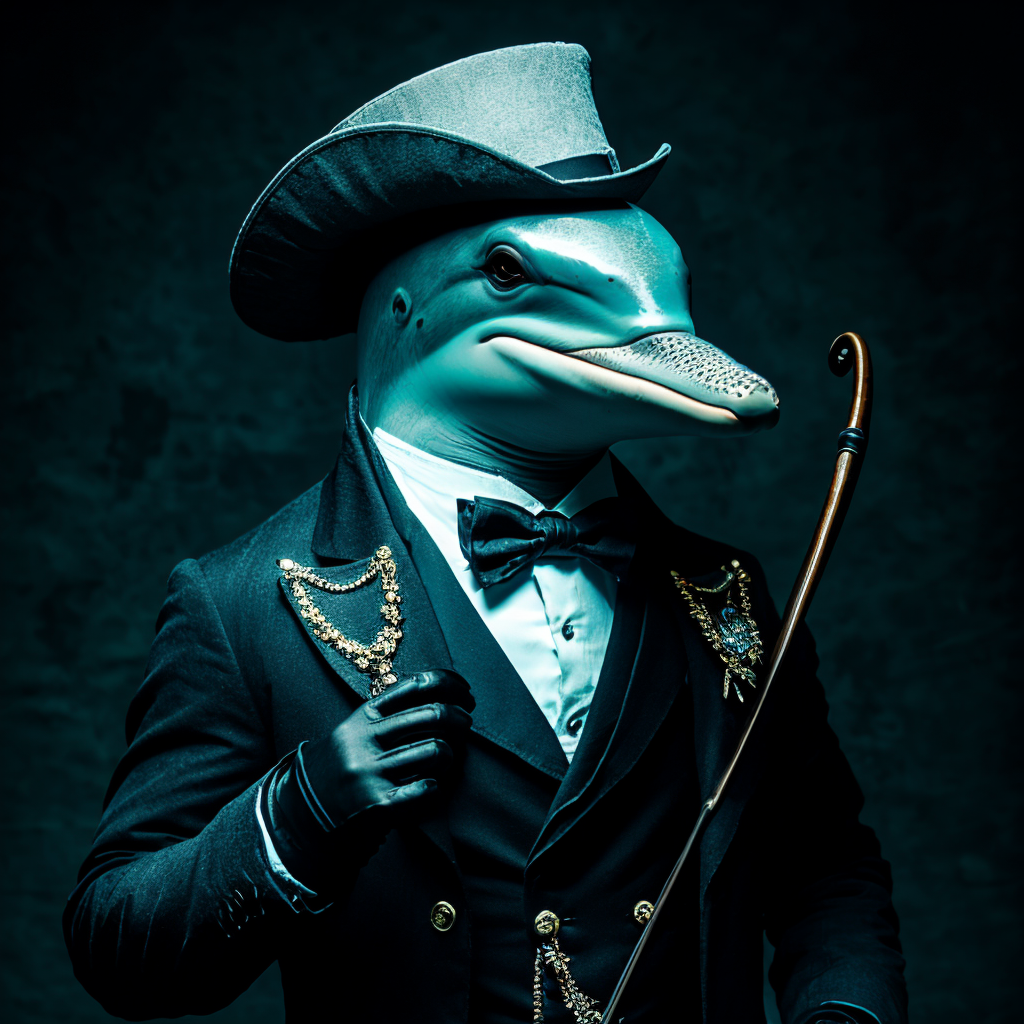 <lora:AnthropomorphicSD1:1> Anthropomorphic, cinematic setting, The image shows a dolphin wearing a top hat and coat holding a cane against a dark background., hat, top hat, bowtie, bow, gloves, solo, cane, 1boy, black gloves, male focus