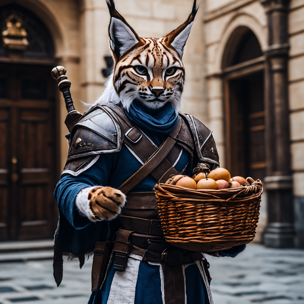 <lora:AnthropomorphicSD1:1> Anthropomorphic, cinematic setting, The image shows a lynx wearing a costume and holding a basket in its hand standing in front of a building with a blurred background., basket, blurry background, weapon, furry, blurry, quiver, furry male, weapon on back, holding, solo