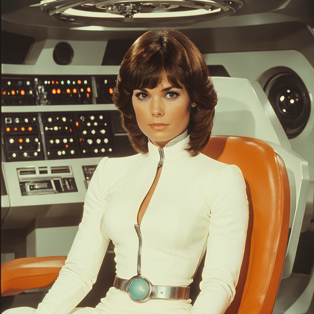 <lora:70sSci-FiMovieSD1:1> ArsMovieStill, movie still from a 1970s technicolor Sci-Fi movie, The image is a portrait of a woman sitting on a chair in a futuristic space station. She is wearing a white and turquoise outfit with a high neckline and long sleeves. The outfit has a silver belt with a red and orange logo on it. The woman has shoulder-length dark hair styled in a bob with bangs and is looking directly at the camera with a serious expression. The background is blurred but it appears to be a control room with various electronic devices and equipment. The overall mood of the image is futuristic and futuristic., 1girl, solo, gloves, brown hair, sitting, elbow gloves, breasts, dark skin, belt, looking at viewer
