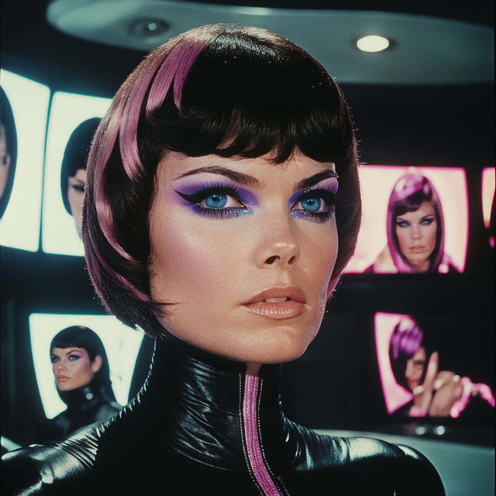 <lora:70sSci-FiMovieSD1:1> ArsMovieStill, movie still from a 1970s technicolor Sci-Fi movie, The image is a close-up portrait of a woman's face. She has a serious expression with her eyes looking directly at the camera. Her hair is styled in a short bob with bangs. Her makeup is dramatic with a pink and purple glittery eye makeup look. The background is blurred but it appears to be a room with multiple televisions. The overall mood of the image is futuristic and edgy., 1girl, parted lips, black hair, solo, lips, short hair, blue eyes, realistic, looking at viewer, portrait