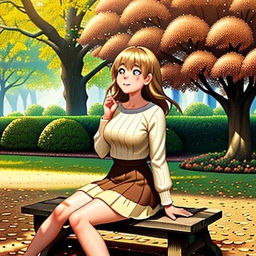 A young, charming girl sits on a wooden bench in a picturesque park during a serene autumn afternoon. Her expressive, almond-shaped eyes gleam with natural curiosity, framed by long, thick lashes and subtly blushed cheeks that add warmth to her soft, flawless complexion. Her silky, shoulder-length hair flows gently in the breeze, with hints of golden highlights catching the sunlight. She wears a cream-colored knitted top with intricate cable patterns, paired with a light floral skirt that brushes her knees. The environment is rich with detail: fallen leaves in vibrant hues of amber, crimson, and gold scatter across the cobblestone path. The texture of the bench is worn but elegant, its wooden grain visible under the soft light. A nearby fountain trickles melodiously, surrounded by carefully manicured bushes adorned with late-blooming flowers. The air feels fresh and crisp, as the sun peeks through the canopy of trees, casting dappled shadows on the ground.