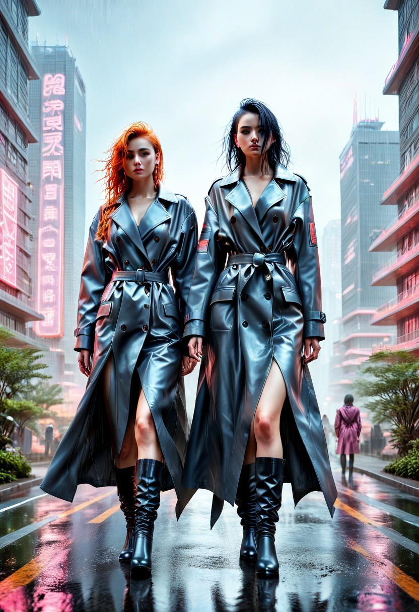 2girls, two women (wearing long coats and boots) walking through a rain swept futuristic cityscape, cyberpunk style, ultra realistic, high quality, masterpiece, extremely detailed, hd, high_detailed,<lora:coralbugXL:1>