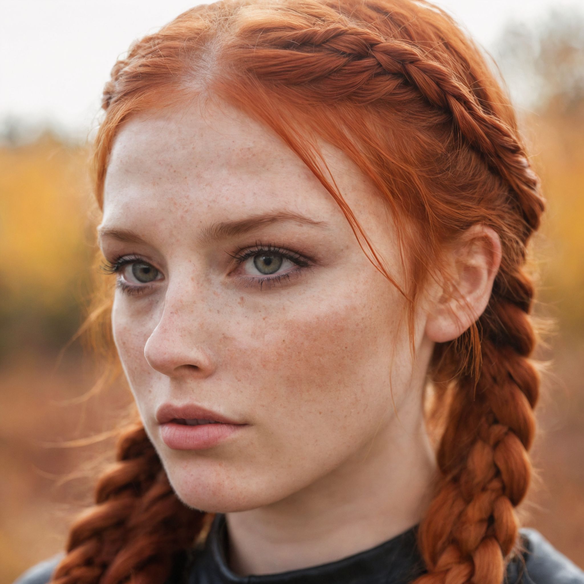 8k, photorealistic, dof, colourful, stunning redhead, fall colors, (detailed_face:1.2), long_hair, braids, freckles, (makeup eyeliner lipstick:0.8), bright_detailed_eyes, eye level, portrait, soft light
