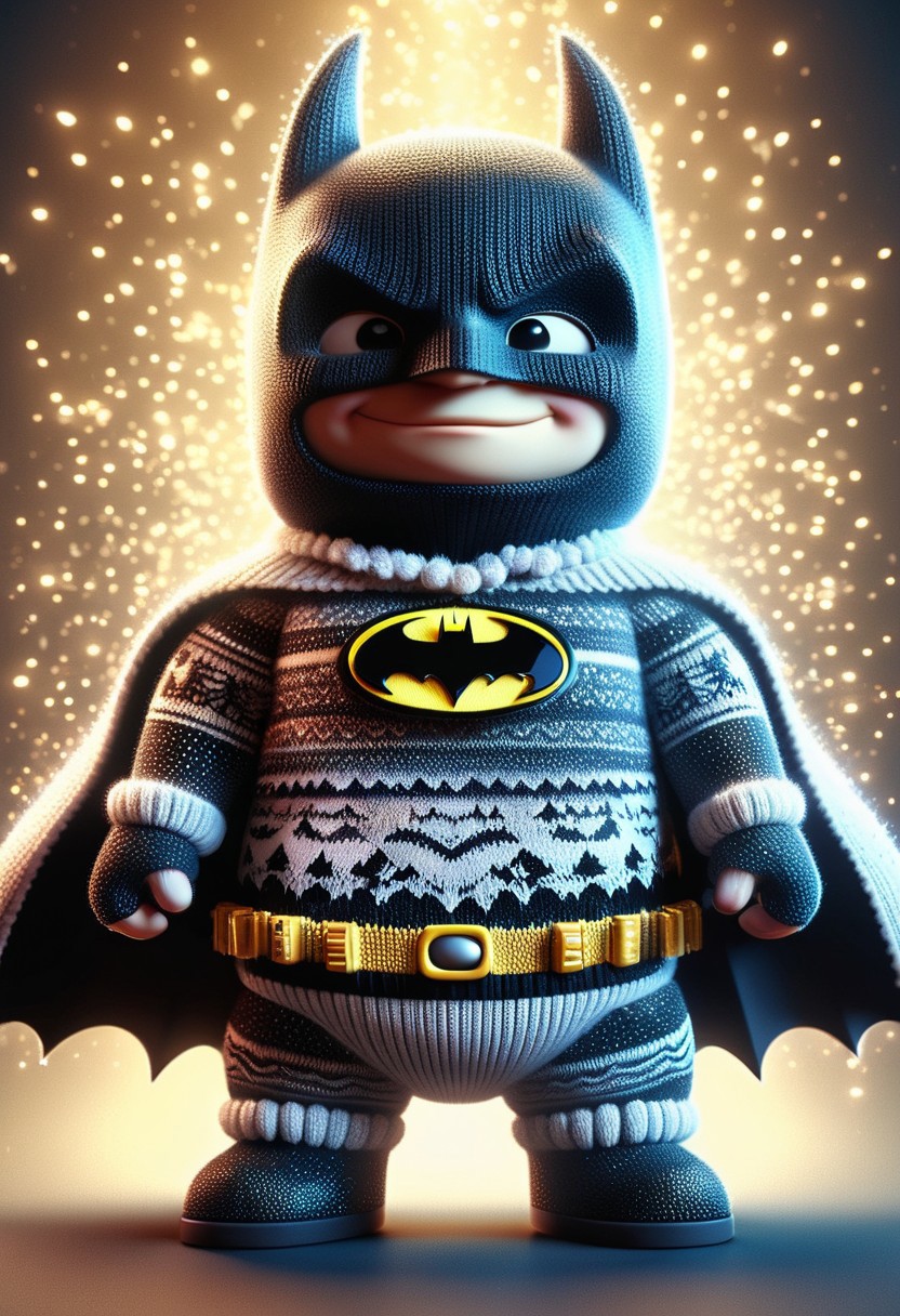 christmassweater, Highly detailed Dynamic shot of majestic adorable batman, high quality, beautiful masterpiece, fantasy creature, kawaii, digital art, glowing sparkles