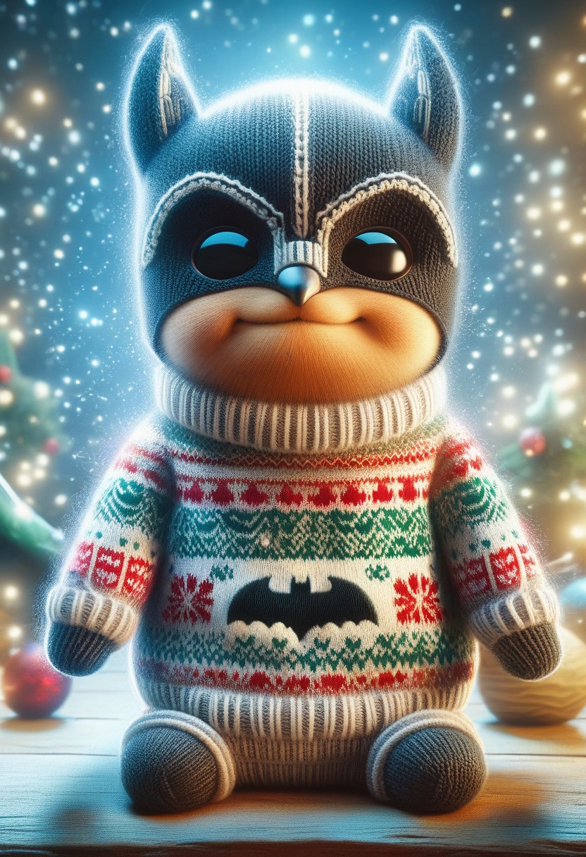 christmassweater, Highly detailed Dynamic shot of majestic adorable batman in xmas sweater, high quality, beautiful masterpiece, fantasy creature, kawaii, digital art, glowing sparkles, gotham, batman
