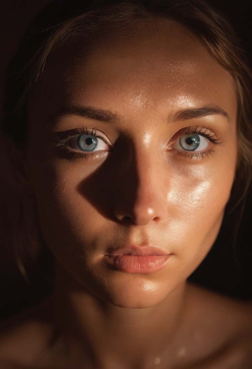Surreal lighting effects, glowing reflective skin, contrasting warm-cold tones, ambient underlighting, soft shadows, sharp focus on eyes <lora:epicNewPhoto:0.3>