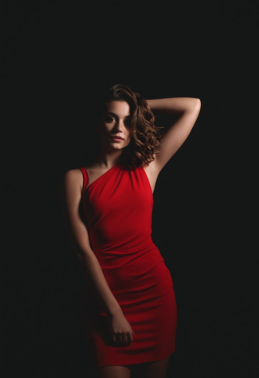 The image is a portrait of a young woman posing in a dark room. She is standing with her body slightly turned to the side, with her left arm resting on her head and her right arm raised above her head. Her hair is styled in loose waves and she is wearing minimal makeup. The woman is wearing a red dress that is draped over her body, exposing her small breasts. The background is completely black, making the woman the focal point of the image. The lighting is dramatic and dramatic, highlighting her features and emphasizing her curves.