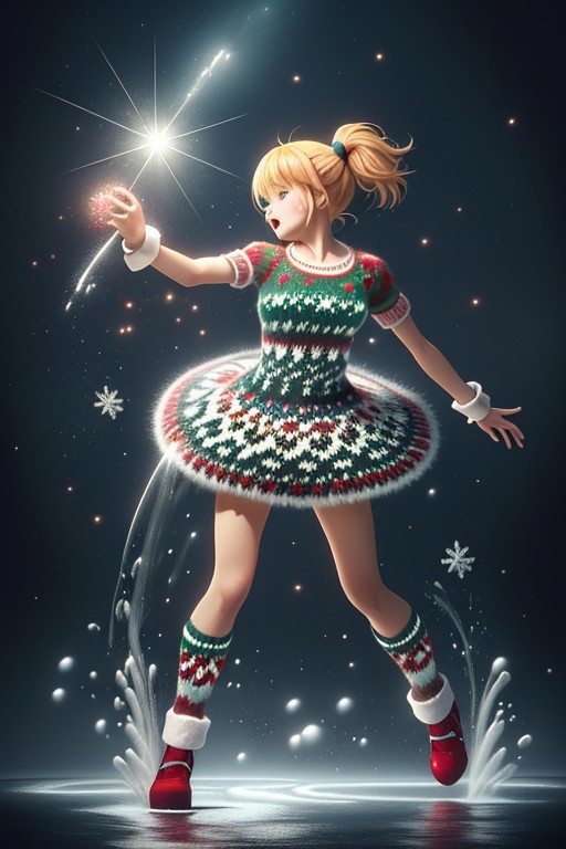 christmassweater, epiCPhotoGasm-colorfulPhoto, splashes, splashing, magical girl wearing a Christmas sweater and magical girl outfit, magical girl dress, full body, dynamic pose,