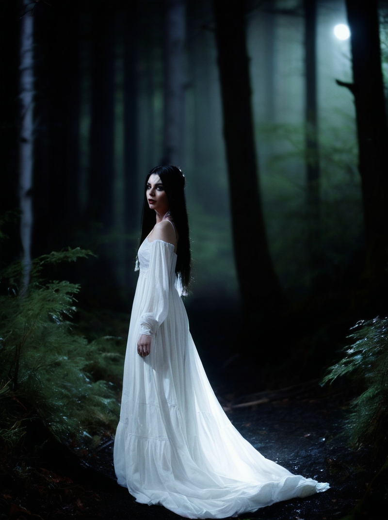 A portrait photograph of Azalea_Miller_P_MXAI_SDXL walking through a dreamlike mystical forest at night, wearing a flowing white dress, cinematic shot