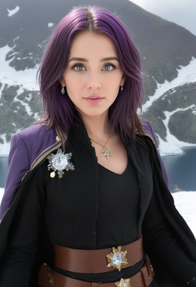 score_9, score_8_up, score_7_up, score_6_up, score_5_up, score_4_up, UHD, 8K, masterpiece, detailed, ultra_high_resolution, lots of detail, OverallDetailXL, detailxl, regalres, Masterpiece, 32k, photorealistic:1.4, score_9, score_8_up, score_7_up, (small waist:2.3), fitness body, toned muscles, wide hips, slender legs, high cheekbones, oval face, 32 years old, mature female, makeup, curvy, office, pretty face, jewelry, solo, lillybunz, (big bright eyes:1.2), beautiful eyes, brown eyes, fully dressed, puffy shoulders, Faris Scherwiz, F4r1s Sch3rw1z, purple hair, jacket, tunic, jewel, Captain, snowflake, hands out of view.