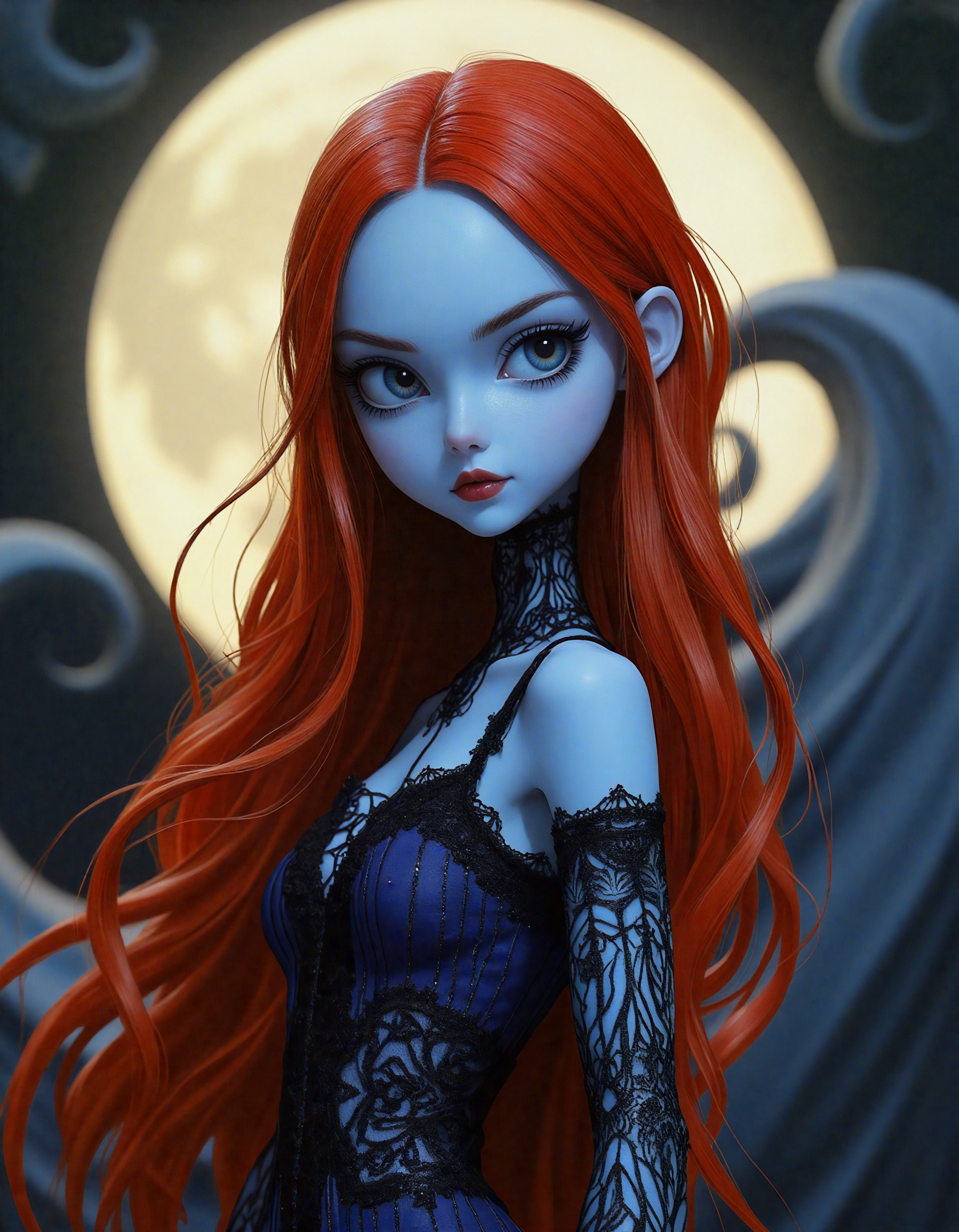 A stunning reimagining of Sally from The Nightmare Before Christmas, designed as a beautiful and stylish figure while maintaining her iconic stitched-together appearance. She has soft, pale blue skin with intricately detailed stitches running across her body, stitched mouth, now resembling elegant embroidery. Her long, flowing red hair cascades like silk, catching subtle glints of moonlight. She wears a modern, high-fashion gown inspired by her patchwork dress, redesigned with a sleek silhouette and bold, contrasting textures, blending delicate lace, velvet, and satin in deep, moody hues like midnight blue, crimson, and black. The background is a softly lit, ethereal scene with a full moon glowing behind her, surrounded by whimsical swirls and patterns reminiscent of Tim Burtonâs aesthetic. Her eyes are large and expressive, framed with delicate eyeliner and a subtle shimmer, conveying both mystery and charm. Dramatic lighting enhances her features and highlights the textures of her ensemble, creating a dreamlike and gothic-chic ambiance.