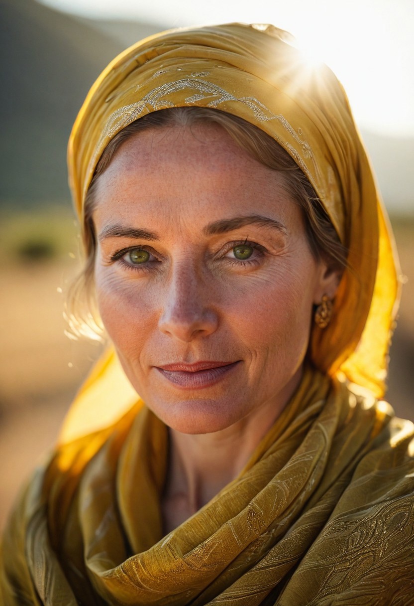 "Ultra-realistic portrait on RED Komodo 6K, Leica APO-Summicron-M 75mm f/2 ASPH, elegant 45-year-old woman's face in dimensional lighting, gossamer yellow headscarf with intricate red-gold border detail, V-shaped draping, natural smile, fine wrinkles caught in golden hour light, sharp focus on sage green eyes, light brown hair wisps, backlit for atmospheric depth, inspired by Sebastião Salgado's documentary style, shot at ISO 200, emphasis on skin texture detail --ar 4:5 --v 6.0 --q 2 --s 750 --style raw"