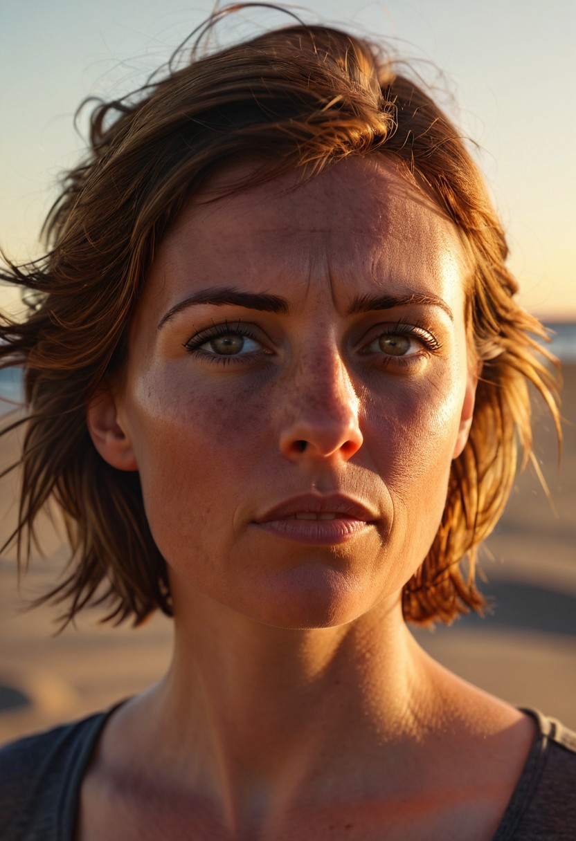 A hyperrealistic, cinematic portrait of a 35-year-old Canadian woman with short, windswept light brown hair. She's standing on a sandy beach at sunset, her skin glowing with a golden hue. Her expression is serene, her eyes gazing into the distance. The sunlight creates a dramatic rim light around her hair, emphasizing its texture and contrast against the darkening sky. Photorealistic, 8K resolution, detailed skin texture, soft focus background.