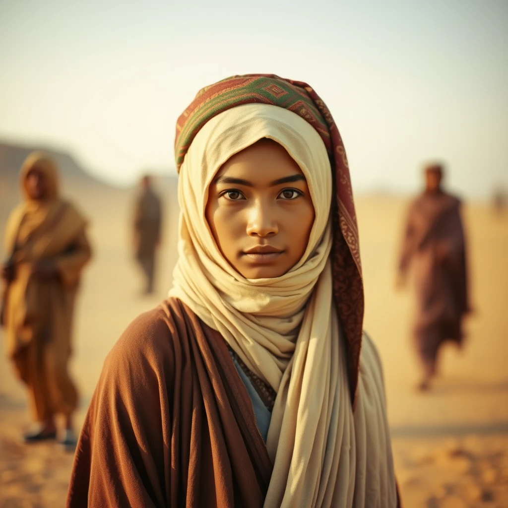 The image shows a person wearing a traditional headscarf and robe, standing in a desert-like environment with other figures in the background. The scene has a warm, dusty atmosphere.