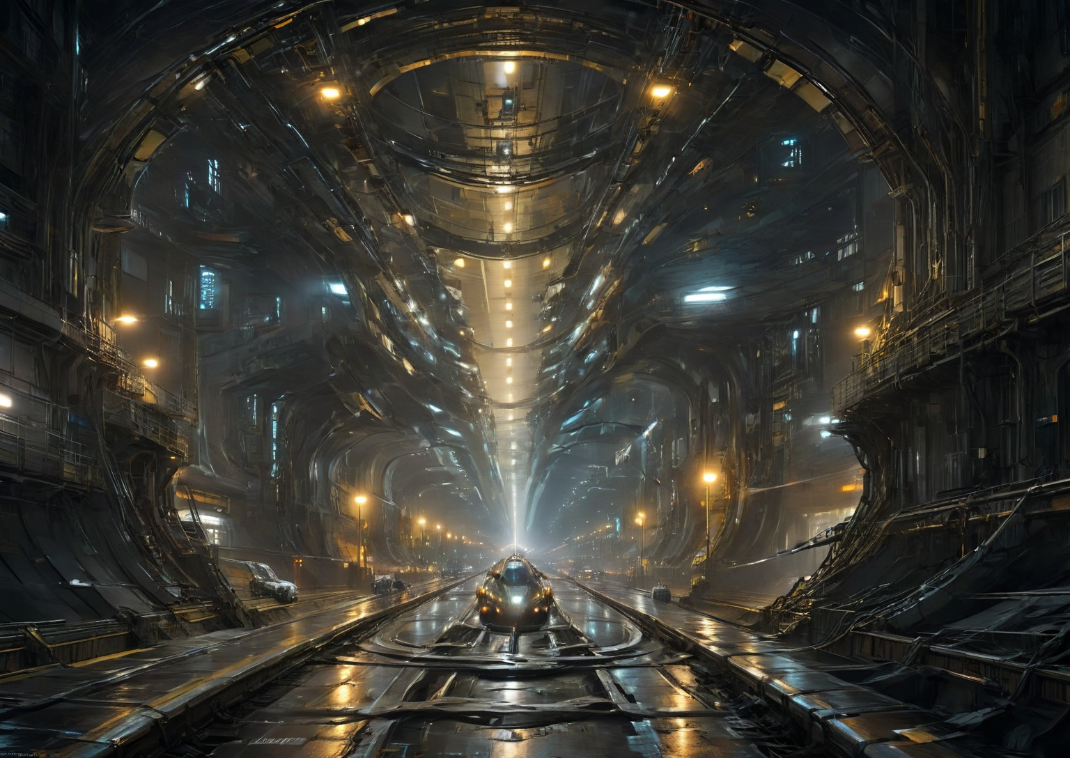 outdoor, award-winning, beautiful, ultra detailed, cinematic, elegant, metallic, sci-fi, Panorama, night time, <lora:AetherPunkAIv2:0.8>, aetherpunkai, <lora:mecha:0.8>, mecha, <lora:tunnel_XL:0.8>, tunnel, <lora:SpaceCraft_XL:0.8>, spcrft