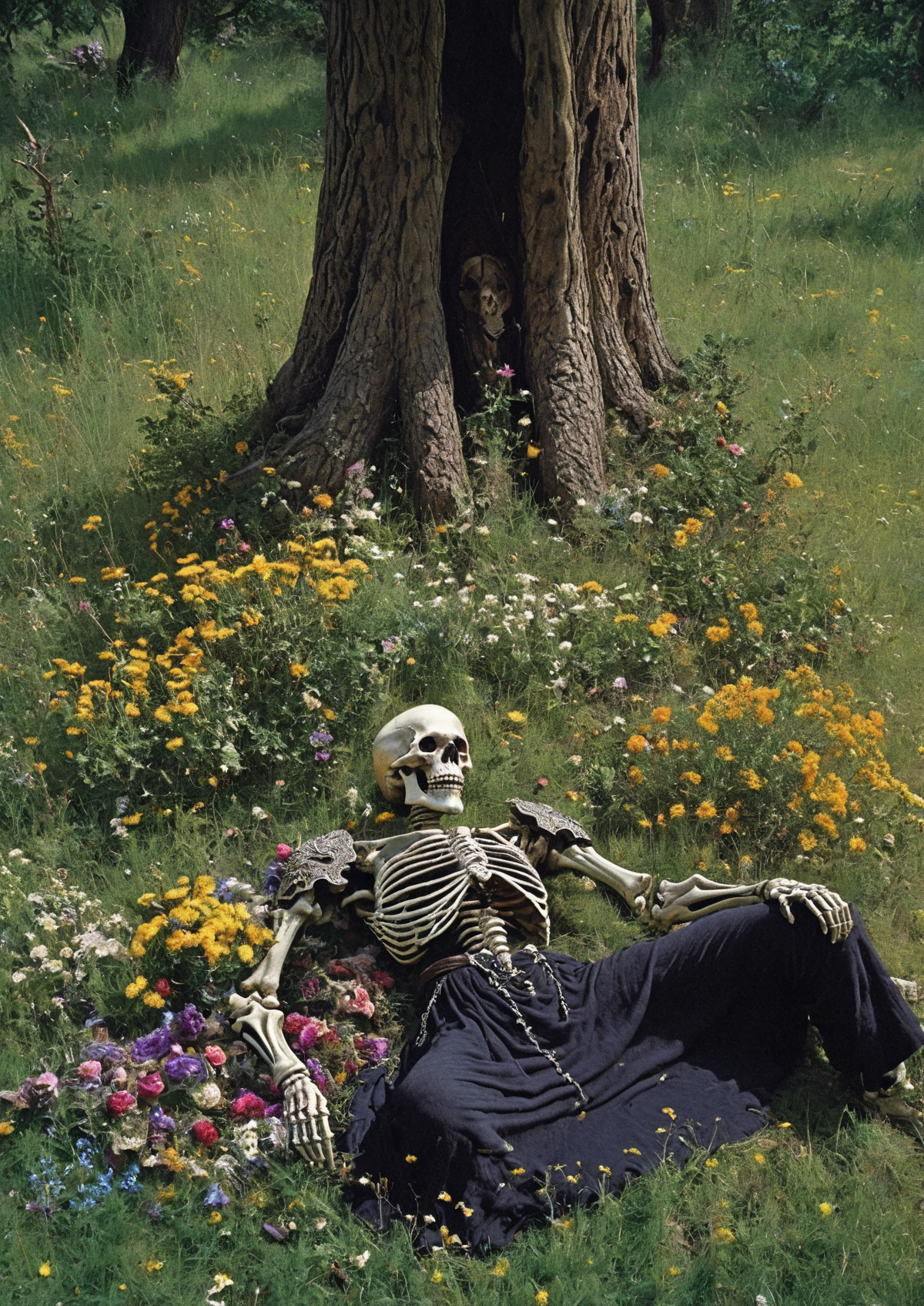 1970's dungeons and dragons dark fantasy artstyle, dark fantasy style, solo, from above, a skeleton in armor is sitting on the ground and leaning against a tree, a large tree, a glade of flowers, casual medival fabric clothes, ripped fabric clothes, 1skull, grain, cinematic, realistic, photo, <lora:dark_fantasy:1>