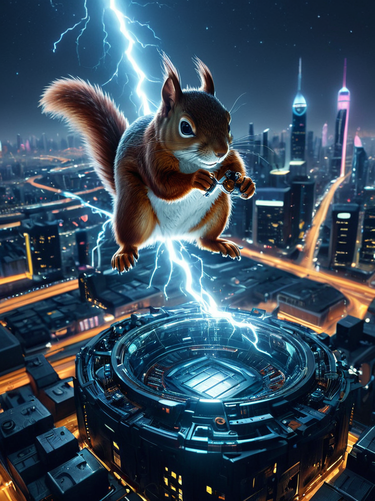 A high definition epic photograph of (( Squirrel, combined with Emotion Vampire: A translucent mechanical being that feeds on raw emotional energy. , Infront of Futuristic Metropolis at Night: A sprawling cityscape illuminated by neon lights and flying vehicles under a starry sky.)) in the background.(dynamic:1.1), sun rays,, (taken by 15mm fisheye lens:1.1),shots showing emotions, shiny reflective metal, Mechanical elements = ((Vivid, HDR, Canon50, 8K, Hyper Realistic, Dramatic, Epic, Dynamic Contrast, Cinematic Lighting, Bright)) (((Zoomed Out, Far away Shot))) = =. Epic dynamic lighting . =vibrant, highly detailed, psychedelic ((Vivid, Epic, Dynamic contrast)) (((Zoomed out, Far away shot, In frame)), <lora:juggernautXL_version6Rundiffusion:0.8> <lora:crystalClearXL_ccxl:0.8> <lora:TransformersStyleXL:0.8> rmspdvrs, nhdsrmr, hlhdsrmr, crstlhdsrmr, chhdsrmr<lora:glowneon_xl_v1:0.6> glowneon, glowing, sparks, lightning <lora:atlantysUltimanimeXL_atlasAtlantys:0.8><lora:epicrealismXL_v5Ultimate:0.8> <lora:extremely_detailed:1.2> <lora:brho:0.4> brho <lora:eyetune:1>, - Generate images with sharp edges and fine details. - Produce high-resolution images with no blurriness or distortions. - Create images with clear and well-defined subjects. - Ensure that the output images have crisp lines and distinct features. - Generate images with vibrant colors and accurate tones. - Avoid noise or artifacts in the generated images. - Focus on producing clear textures and patterns in the images. - Emphasize clarity and definition in all aspects of the generated images. - Prioritize the sharpness and clarity of the main subjects in the images. - Optimize the AI model to produce clear and visually appealing images., Wlop