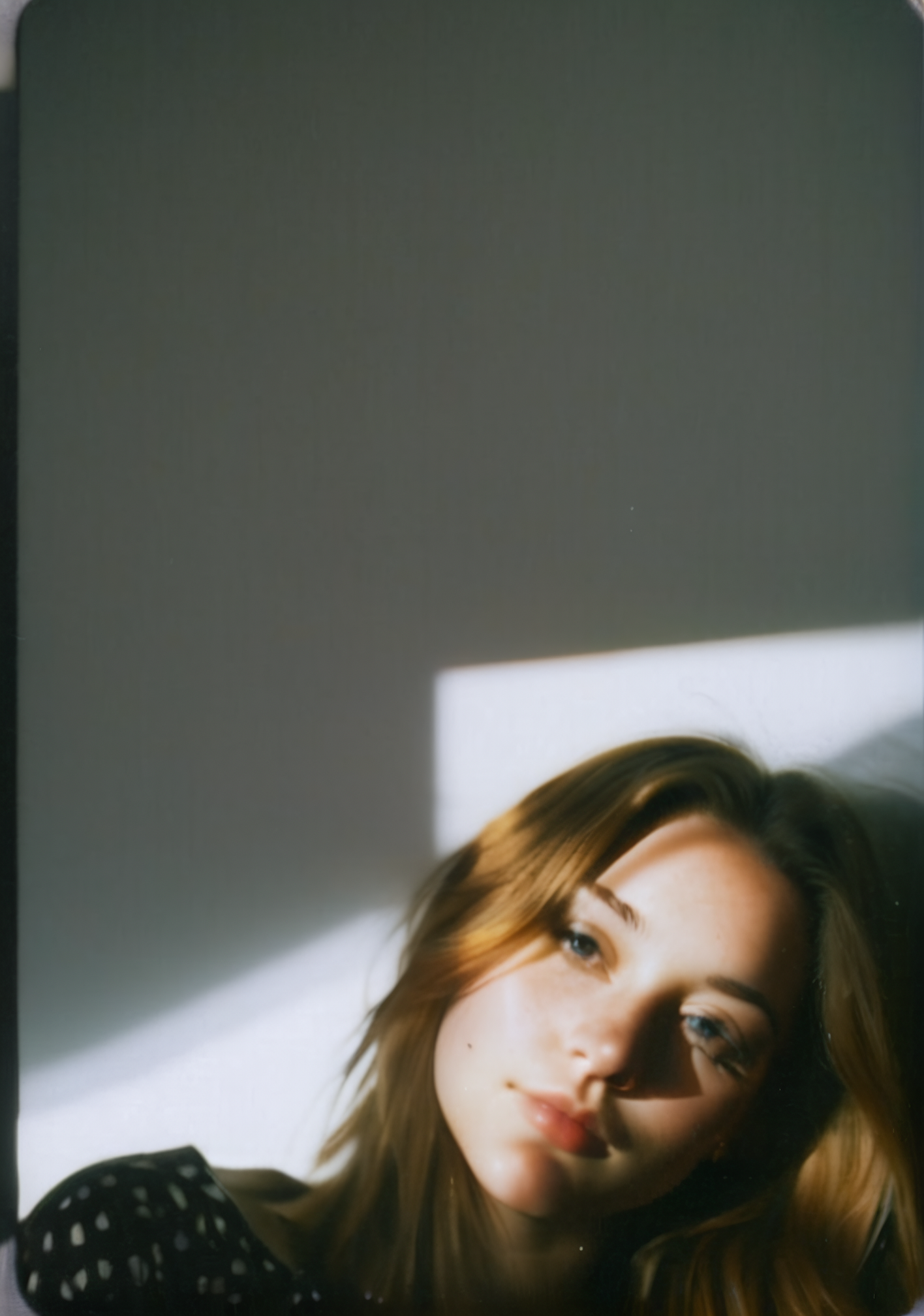 FP100C, Portrait, womans bedroom scene, portrait photo of stylish 21yo Canadian woman, soft facial features, perfect detailed eyes, natural skin, (hard shadows:.81), prismatic light, grainy, (shadows), spotlight, sensual, voyuerism <lora:FP100C_frameless:1>