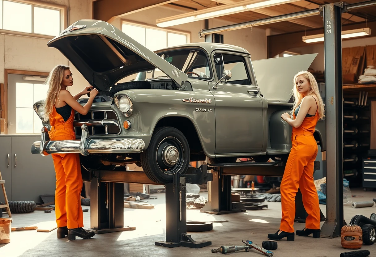 A vintage car repair shop. 1954 Chevrolet Pickup-Truck is standing on a lifting platform. the bonnet opened, two beautiful female mechanics with long blonde hair in orange overalls are dismantling the wheels of the pick-up. warm sunlight shines through the open doors onto the two of them. there are lots of tools and car parts on the floor of the garage.