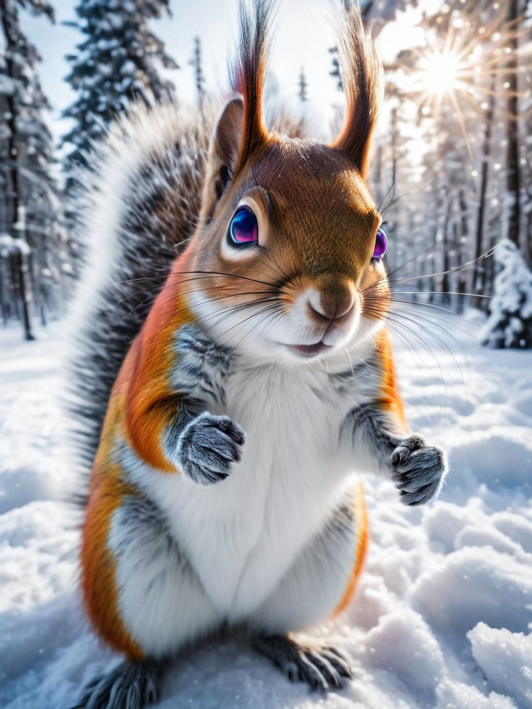 A high definition epic photograph of ((25. A squirrel dressed like a superhero, striking a heroic pose but looking hilariously unsure of itself. 50: Engaging strangers in deep philosophical discussions about life choices but doing so dressed as cartoon characters; mixing humor with serious topics unexpectedly! These bizarre actions combine creativity with humor, showcasing unique behaviors that can evoke laughter or intrigue!)).Whiteout Conditions: Heavy snowfall combined with strong winds creates near-zero visibility and disorients travelers completely.(dynamic:1.1), sun rays,, (taken by 7.5mm fisheye lens:1.1),shots exaggerated emotions. Manic expression = ((Vivid, HDR, Canon50, 8K, Hyper Realistic, Dramatic, Epic, Dynamic Contrast, Cinematic Lighting, increased brightness)) (((Zoomed Out, Far away Shot))) = =. Epic dynamic lighting . =vibrant, highly detailed, psychedelic ((Vivid, Epic, Dynamic contrast)) (((Zoomed out, Far away shot, In frame)), <lora:juggernautXL_version6Rundiffusion:0.8> <lora:crystalClearXL_ccxl:0.8> <lora:atlantysUltimanimeXL_atlasAtlantys:0.8><lora:epicrealismXL_v5Ultimate:0.8> <lora:extremely_detailed:1><lora:realvisxlV40_v40Bakedvae:0.8> <lora:glowneon_xl_v1:0.6> glowneon, glowing, sparks, <lora:rainbow_iris_v2:0.8> raibow eyes, rainbow eyes, no humans, fractal iris, - Generate images with sharp edges and fine details. - Produce high-resolution images with no blurriness or distortions. - Create images with clear and well-defined subjects. - Ensure that the output images have crisp lines and distinct features. - Generate images with vibrant colors and accurate tones. - Avoid noise or artifacts in the generated images. - Focus on producing clear textures and patterns in the images. - Emphasize clarity and definition in all aspects of the generated images. - Prioritize the sharpness and clarity of the main subjects in the images. - Optimize the AI model to produce clear and visually appealing images., Wlop