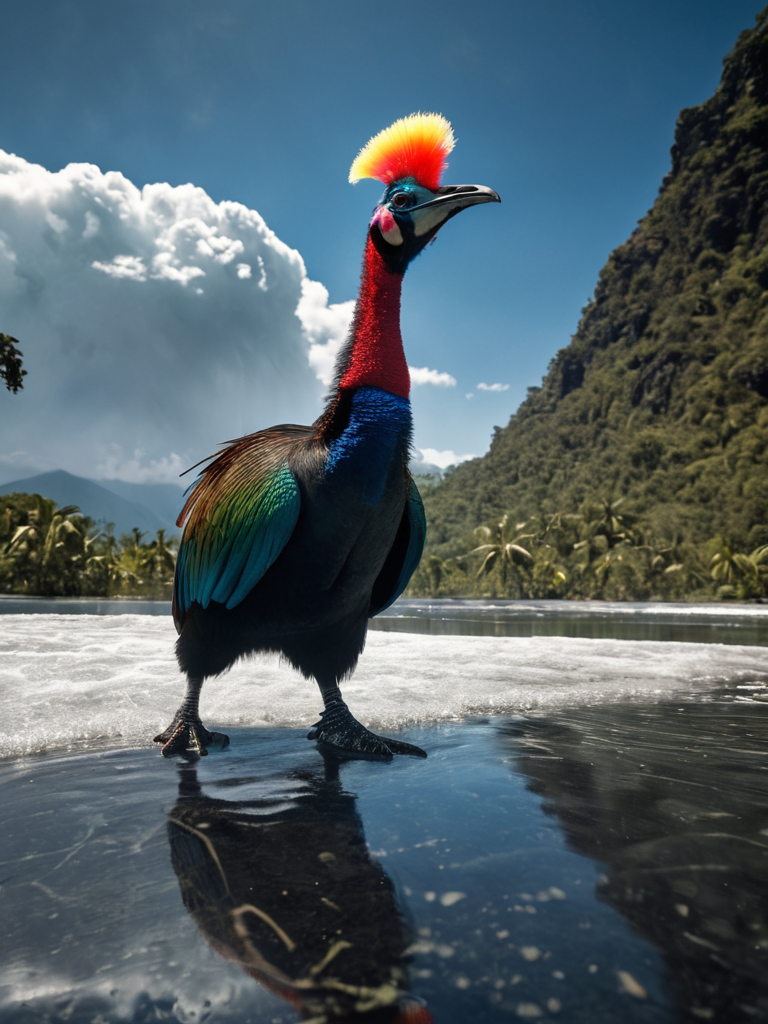 cinematic film still A high definition epic photograph of ((23. Cassowary: A cassowary strutting around with its colorful casque raised high, looking fierce yet utterly confused by its own reflection. Stacking watermelons into a pyramid while wearing rollerblades on an icy lake: Sliding back and forth precariously as they carefully balance each melon, shouting, âThis is art in motion!â)).Volcanic Lightning: Lightning bolts crackle within volcanic ash clouds during eruptions, creating a dramatic display.(dynamic:1.1), sun rays,, (taken by 7.5mm fisheye lens:1.1),shots exaggerated emotions. Manic expression = ((Vivid, HDR, Canon50, 8K, Hyper Realistic, Dramatic, Epic, Dynamic Contrast, Cinematic Lighting, increased brightness)) (((Zoomed Out, Far away Shot))) = =. Epic dynamic lighting . =vibrant, highly detailed, psychedelic ((Vivid, Epic, Dynamic contrast)) (((Zoomed out, Far away shot, In frame)), <lora:juggernautXL_version6Rundiffusion:0.8> <lora:crystalClearXL_ccxl:0.8> <lora:atlantysUltimanimeXL_atlasAtlantys:0.8><lora:epicrealismXL_v5Ultimate:0.8> <lora:extremely_detailed:1> <lora:glowneon_xl_v1:0.6> glowneon, glowing, sparks,, - Generate images with sharp edges and fine details. - Produce high-resolution images with no blurriness or distortions. - Create images with clear and well-defined subjects. - Ensure that the output images have crisp lines and distinct features. - Generate images with vibrant colors and accurate tones. - Avoid noise or artifacts in the generated images. - Focus on producing clear textures and patterns in the images. - Emphasize clarity and definition in all aspects of the generated images. - Prioritize the sharpness and clarity of the main subjects in the images. - Optimize the AI model to produce clear and visually appealing images., Wlop . shallow depth of field, vignette, highly detailed, high budget, bokeh, cinemascope, moody, epic, gorgeous, film grain, grainy
