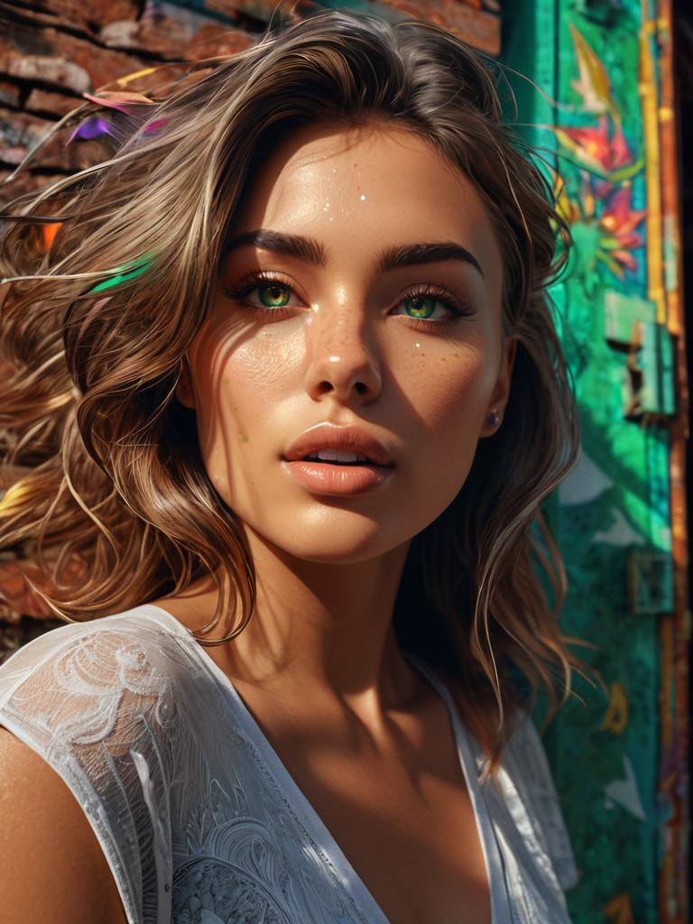 cinematic film still (((A beautiful Surreal Wonder: Wide-open eyes filled with awe and amazement; mouth agape in disbelief while standing still with arms relaxed at the sides or slightly raised as if embracing the moment.,Empowered,30 years old woman, withWarm golden-brown complexion glowing under sunlight; bright green eyes sparkling with creativity and ambition; long wavy dark brown hair framing her face beautifully.,))) with Sporting Holographic Stickers: Covered in shimmering holographic stickers that change images as you move around it. The camera shot is Captivating Textures Found in Urban Decay Photography: Focus on peeling paint, rusted metal surfaces, or crumbling bricks within abandoned buildings revealing stories hidden beneath layers over time!.(dynamic:1.1),sun rays,(taken by 12.5mm fisheye lens:1.1), Vivid, HDR, Canon50, 8K, Hyper Realistic, Dramatic, Epic, Dynamic Contrast, Cinematic Lighting, increased brightness)(((Zoomed Out, Far away Shot))) = =. Epic dynamic lighting , vibrant,highly detailed,psychedelic,((Psychedelic, rainbow glow )) ((Vivid, Epic, Dynamic contrast)) (((Zoomed out, Far away shot, In frame)), (((Cinematic))) <lora:juggernautXL_version6Rundiffusion:0.8> <lora:epicrealismXL_v5Ultimate:0.8> <lora:crystalClearXL_ccxl:0.8>, <lora:detailed_notrigger:0.8>, - Generate images with sharp edges and fine details. - Produce high-resolution images with no blurriness or distortions. - Create images with clear and well-defined subjects. - Ensure that the output images have crisp lines and distinct features. - Generate images with vibrant colors and accurate tones. - Avoid noise or artifacts in the generated images. - Focus on producing clear textures and patterns in the images. - Emphasize clarity and definition in all aspects of the generated images. - Prioritize the sharpness and clarity of the main subjects in the images. - Optimize the AI model to produce clear and visually appealing images., Wlop . shallow depth of field, vignette, highly detailed, high budget, bokeh, cinemascope, moody, epic, gorgeous, film grain, grainy