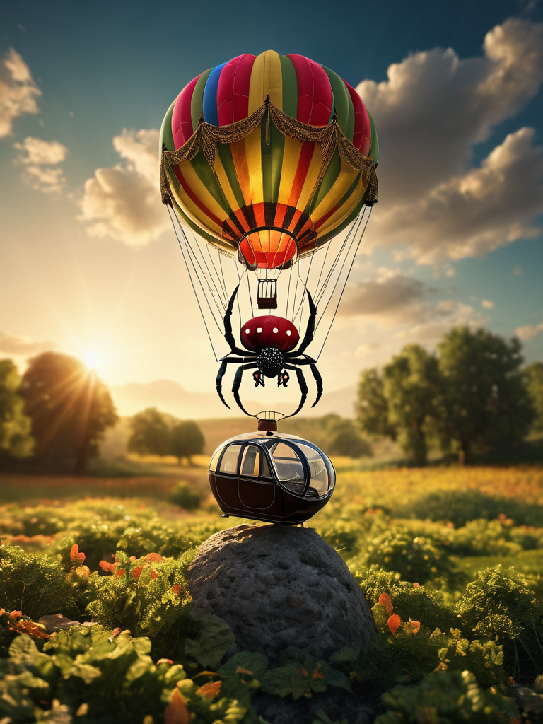 cinematic film still ((foodandveg spider with With a Miniature Hot Air Balloon: Floating gently above the ground, this fruit is ready for an aerial adventure, complete with tiny passengers!)) The camera shot is Extreme Close-Up: Use a macro lens or zoom in even further to capture minute details, such as a single droplet of water or an insectâs eye..(dynamic:1.1),sun rays,(taken by 12.5mm fisheye lens:1.1), Vivid, HDR, Canon50, 8K, Hyper Realistic, Dramatic, Epic, Dynamic Contrast, Cinematic Lighting, increased brightness)(((Zoomed Out, Far away Shot))) = =. Epic dynamic lighting , vibrant,highly detailed,psychedelic,((Psychedelic, rainbow glow )) ((Vivid, Epic, Dynamic contrast)) (((Zoomed out, Far away shot, In frame)), (((Cinematic))) <lora:juggernautXL_version6Rundiffusion:0.8> <lora:epicrealismXL_v5Ultimate:0.8> <lora:crystalClearXL_ccxl:0.8>, <lora:detailed_notrigger:0.8>, - Generate images with sharp edges and fine details. - Produce high-resolution images with no blurriness or distortions. - Create images with clear and well-defined subjects. - Ensure that the output images have crisp lines and distinct features. - Generate images with vibrant colors and accurate tones. - Avoid noise or artifacts in the generated images. - Focus on producing clear textures and patterns in the images. - Emphasize clarity and definition in all aspects of the generated images. - Prioritize the sharpness and clarity of the main subjects in the images. - Optimize the AI model to produce clear and visually appealing images., Wlop . shallow depth of field, vignette, highly detailed, high budget, bokeh, cinemascope, moody, epic, gorgeous, film grain, grainy