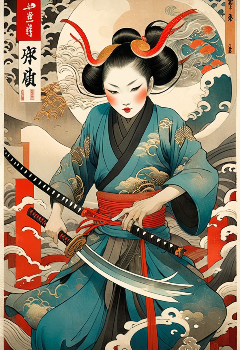 Victo Ngai Style,(ink-style, ink_wash_painting),illustrated by Victo Ngai, man wearing a Japanese warrior outfit, huge katana, Tengu mask , seductive pose